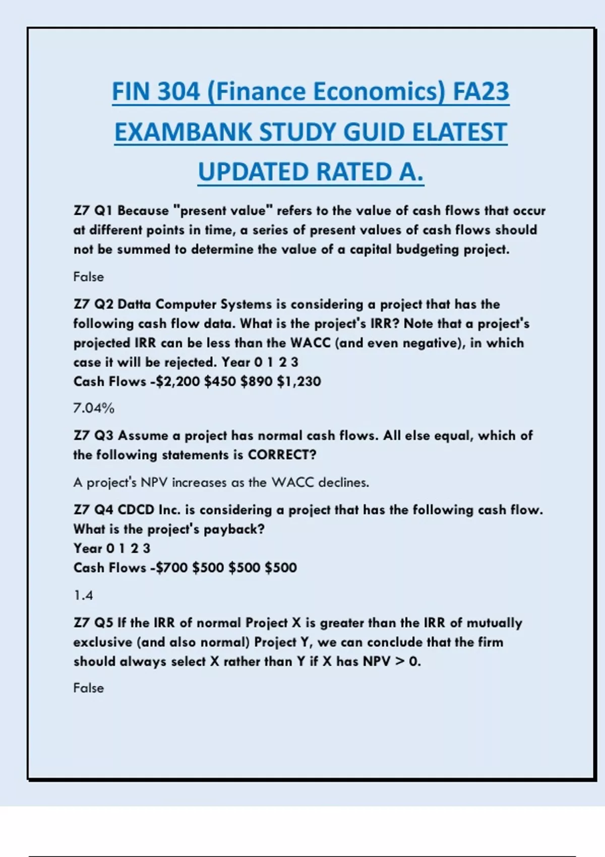 FIN 304 (Finance Economics) FA23 EXAMBANK STUDY GUID ELATEST UPDATED RATED A.