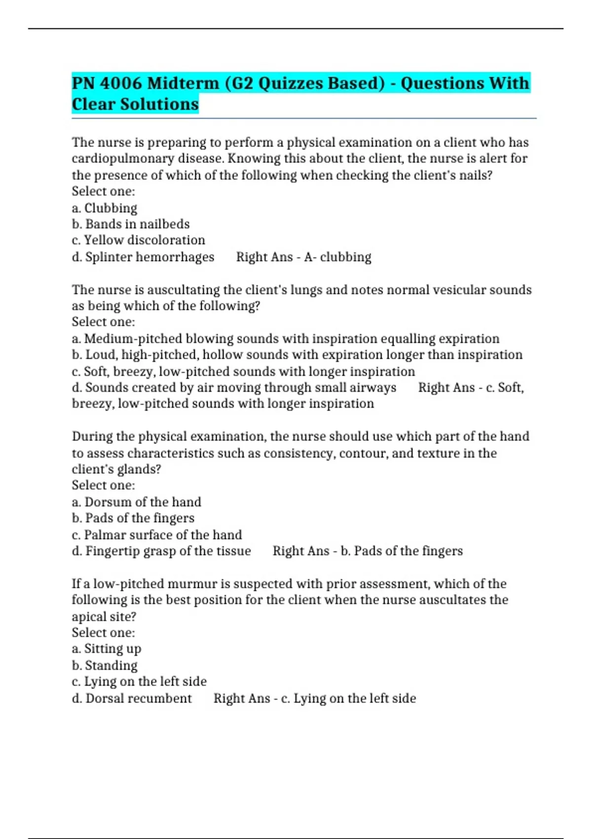cardiopulmonary disease. Knowing this about the client, the nurse is alert for