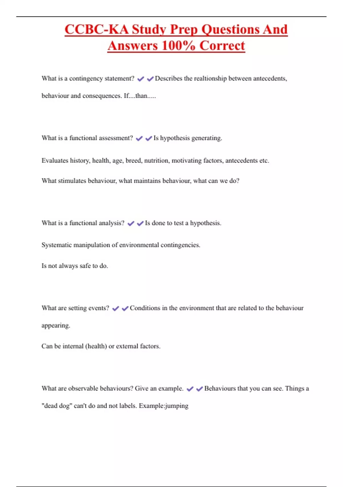 CCBC-KA Study Prep Questions And Answers 100% Correct What is a contingency statement? Describes the realtionship between antecedents, behaviour and consequences. If....than..... What is a functional assessment? Is hypothesis generating. Evaluates history, health, age, breed, nutrition, motivating factors, antecedents etc. What stimulates behaviour, what maintains behaviour, what can we do? What is a functional analysis? Is done to test a hypothesis. Systematic manipulation of environmental contingencies. Is not always safe to do.