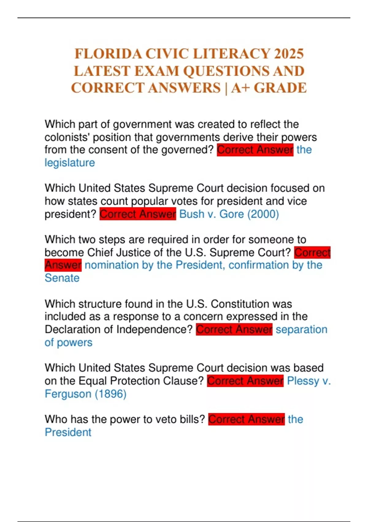 FLORIDA CIVIC LITERACY 2025 LATEST EXAM QUESTIONS AND CORRECT ANSWERS | A+ GRADE
