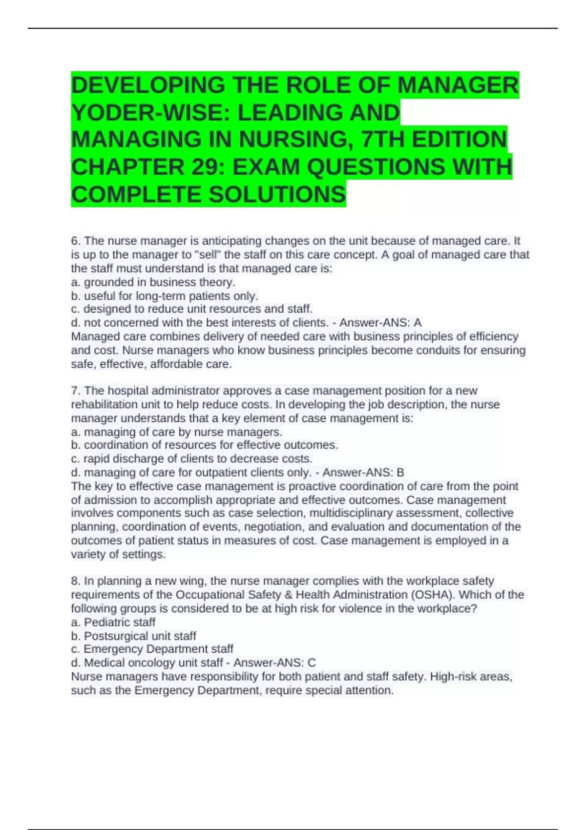 DEVELOPING THE ROLE OF MANAGER YODER-WISE: LEADING AND MANAGING IN NURSING, 7TH EDITION CHAPTER 29: EXAM QUESTIONS WITH COMPLETE SOLUTIONS