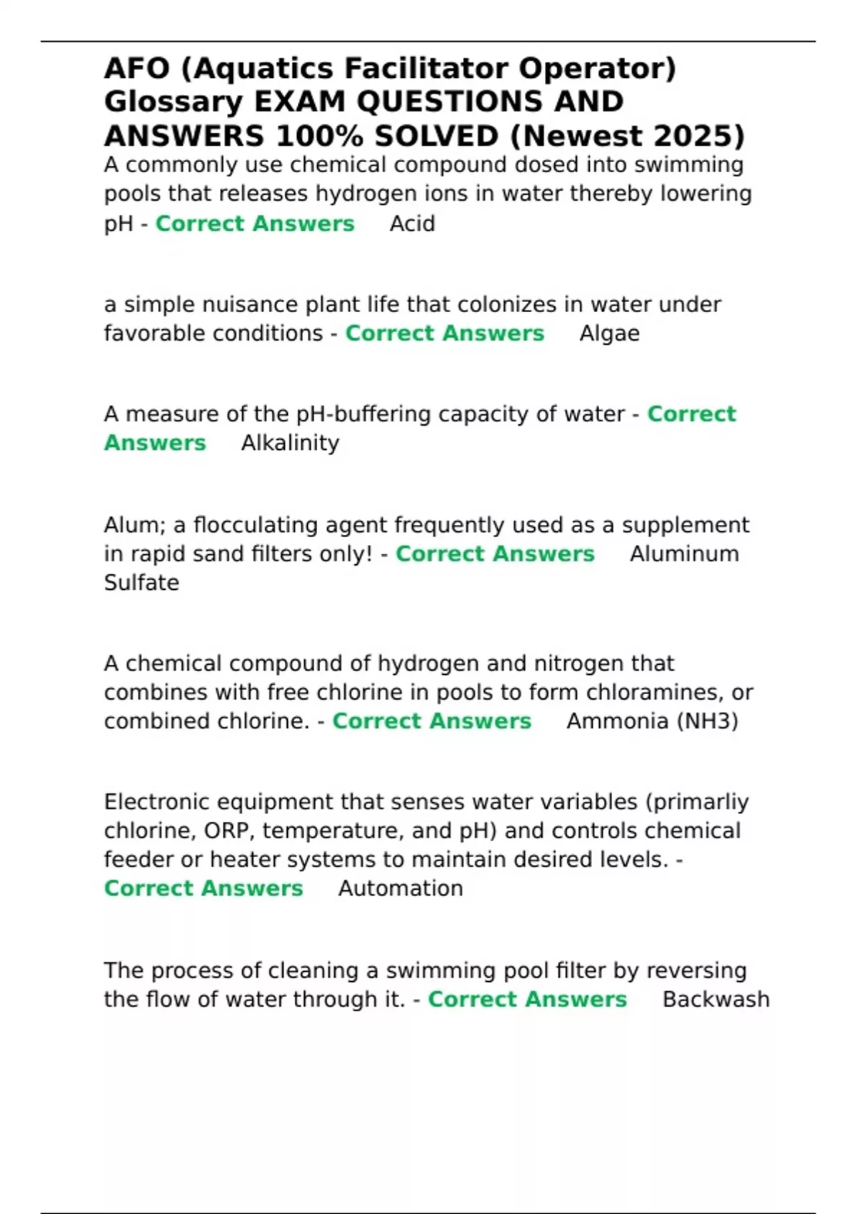 AFO (Aquatics Facilitator Operator) Glossary EXAM QUESTIONS AND ANSWERS 100- SOLVED (Newest