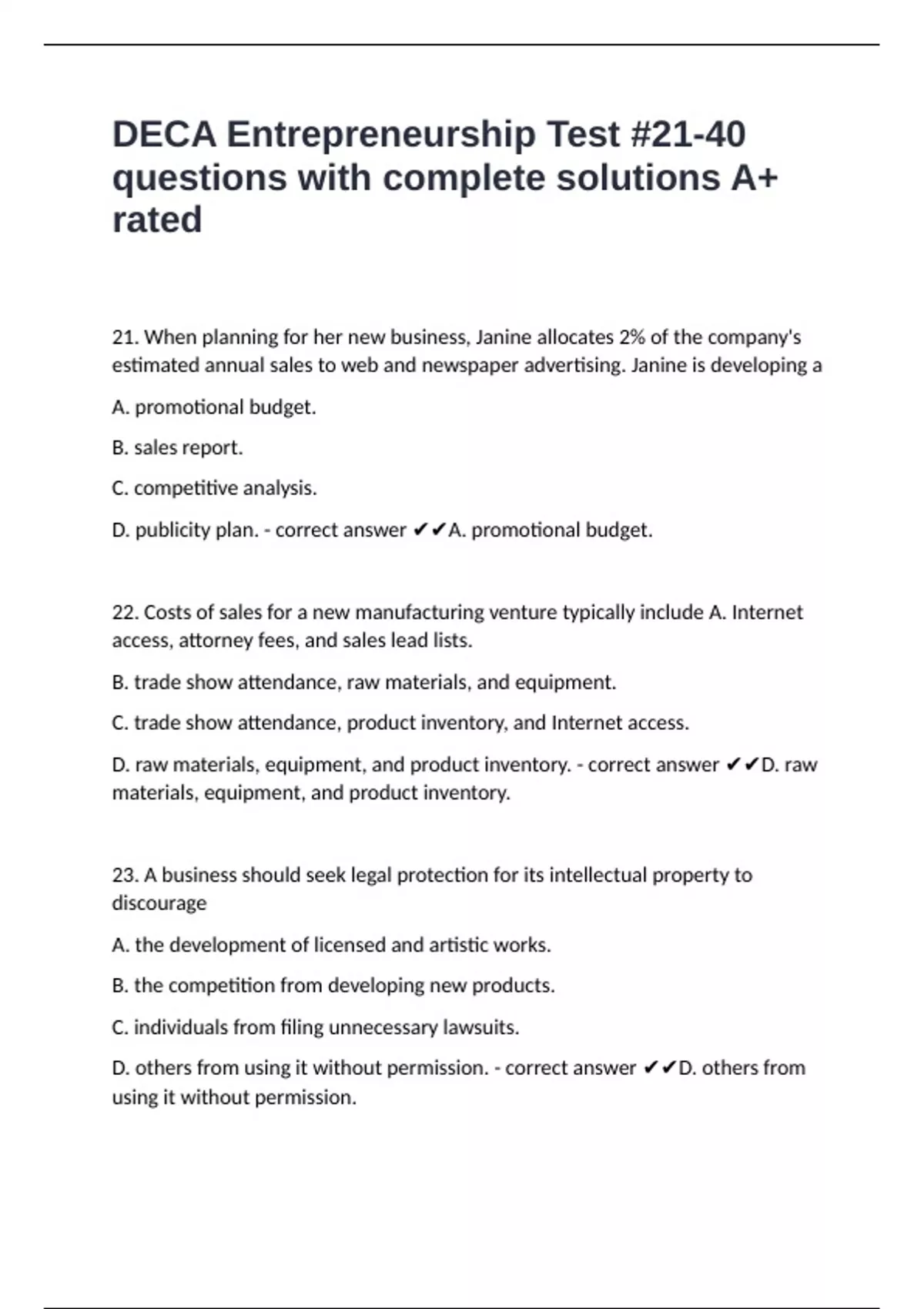 DECA Entrepreneurship Test #21-40 questions with complete solutions A+ rated
