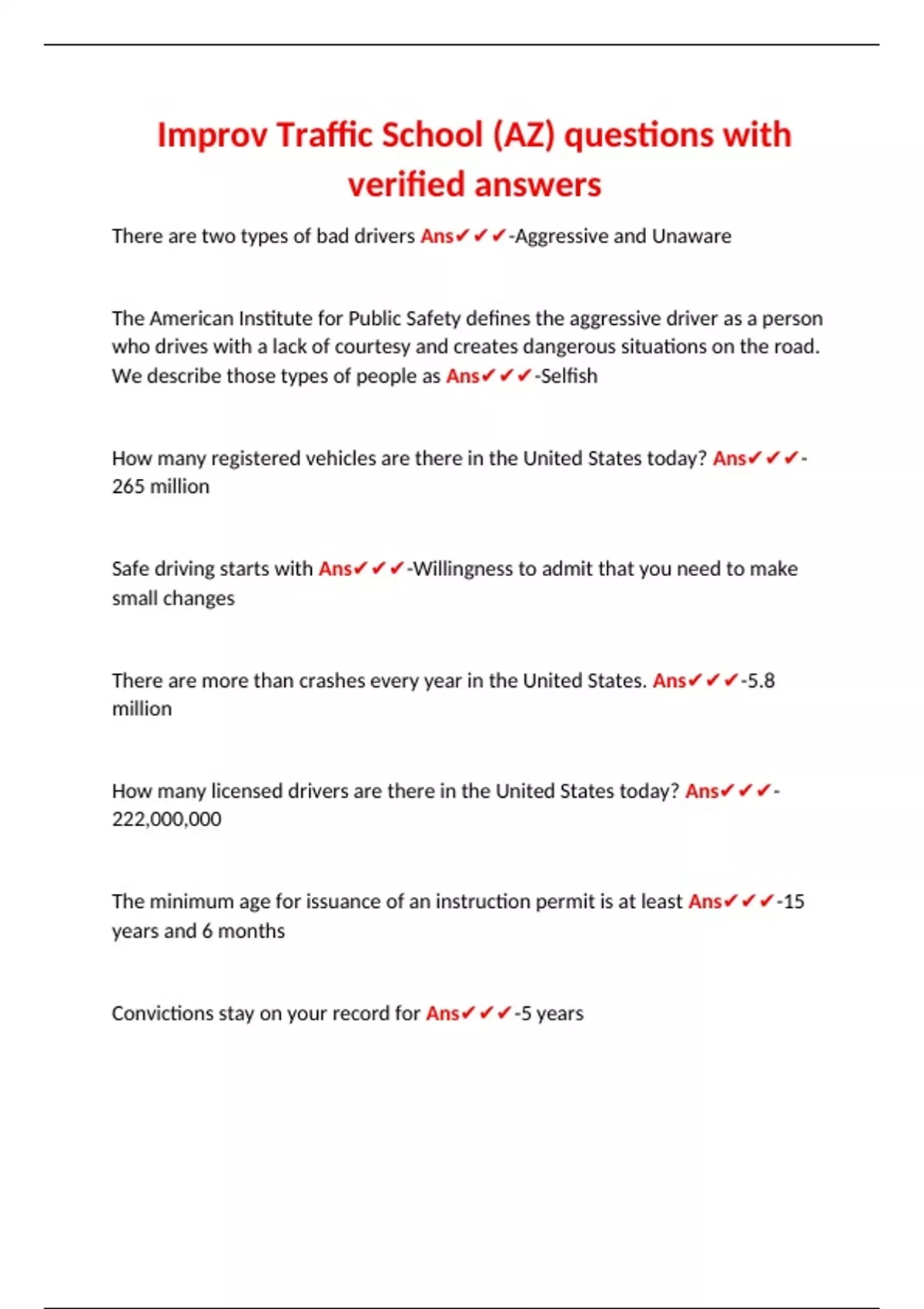 There are two types of bad drivers Ans-Aggressive and Unaware The American Institute for Public Safety defines the aggressive driver as a person who drives with a lack of courtesy and creates dangerous situations on the road. We describe those types of people as Ans-Selfish How many registered vehicles are there in the United States today? Ans-265 million Safe driving starts with Ans-Willingness to admit that you need to make small changes There are more than crashes every year in the United States. Ans-5.8 million How many licensed drivers are there in the United States today? Ans-222,000,000 The minimum age for issuance of an instruction permit is at least Ans-15 years and 6 months Convictions stay on your record for Ans-5 years