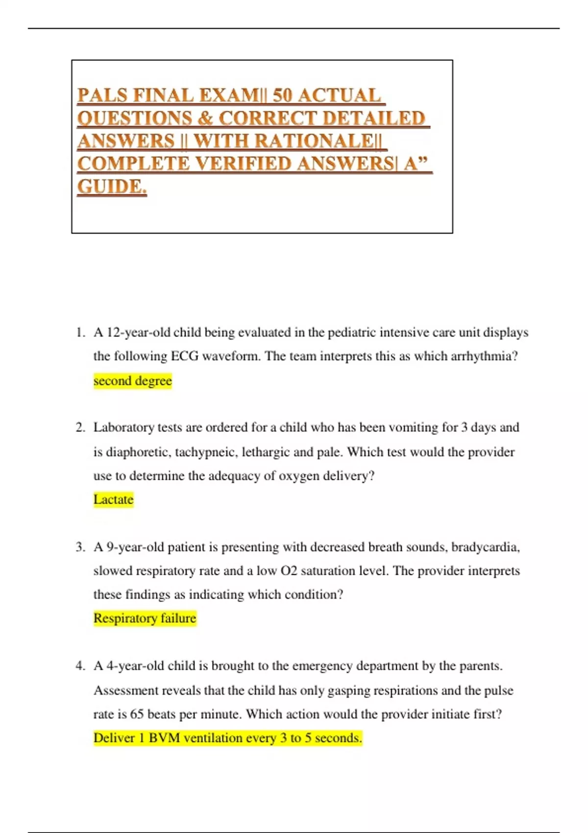 PALS FINAL EXAM|| 50 ACTUAL QUESTIONS & CORRECT DETAILED ANSWERS || WITH RATIONALE|| COMPLETE VERIFIED ANSWERS| A” GUIDE. 1. A 12-year-old child being evaluated in the pediatric intensive care unit displays the following ECG waveform. The team interprets this as which arrhythmia? second degree 2. Laboratory tests are ordered for a child who has been vomiting for 3 days and is diaphoretic, tachypneic, lethargic and pale. Which test would the provider use to determine the adequacy of oxygen delivery? Lactate 3. A 9-year-old patient is presenting with decreased breath sounds, bradycardia, slowed respiratory rate and a low O2 saturation level. The provider interprets these findings as indicating which condition? Respiratory failure