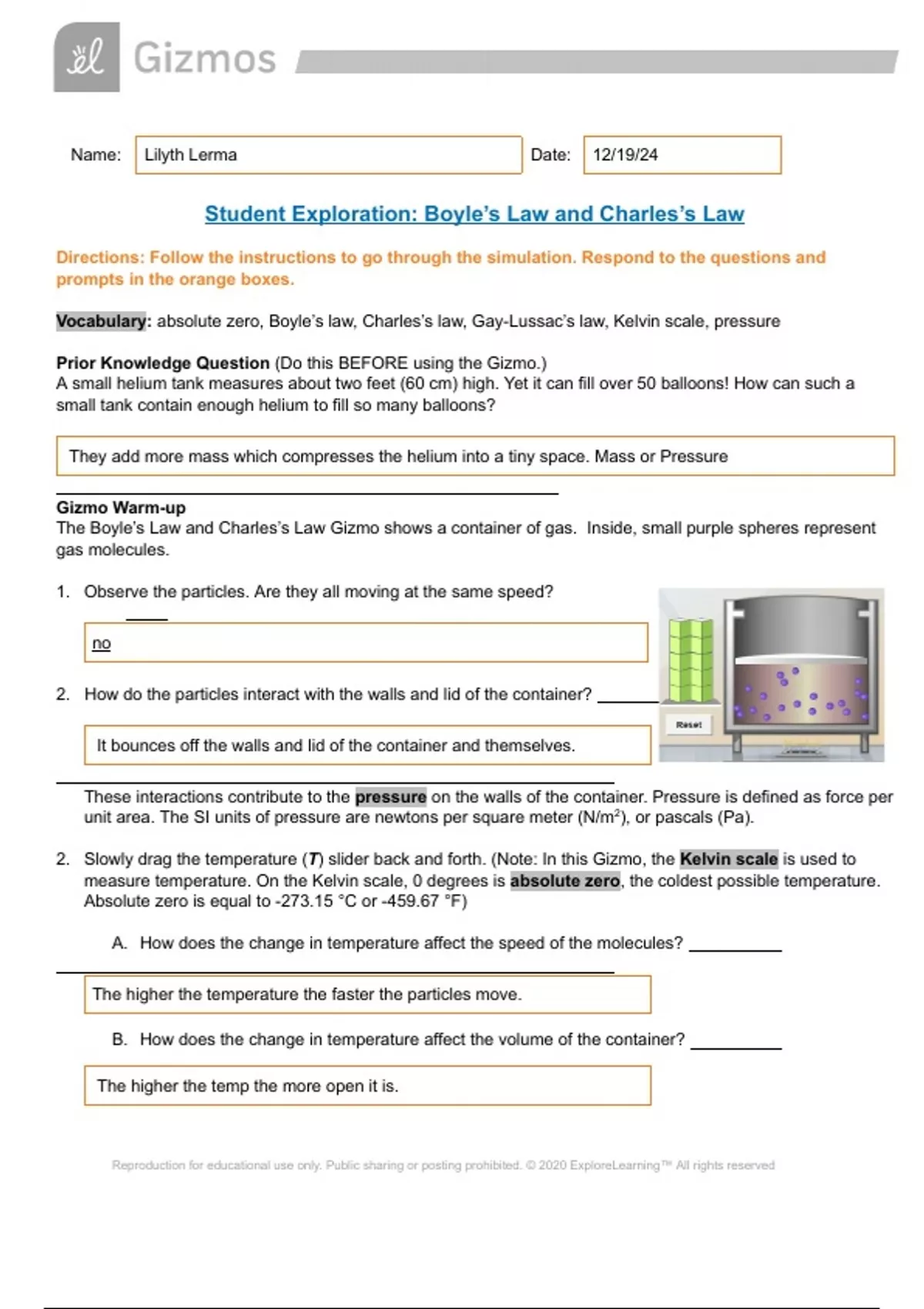 Student Exploration: Boyle’s Law and Charles’s Law