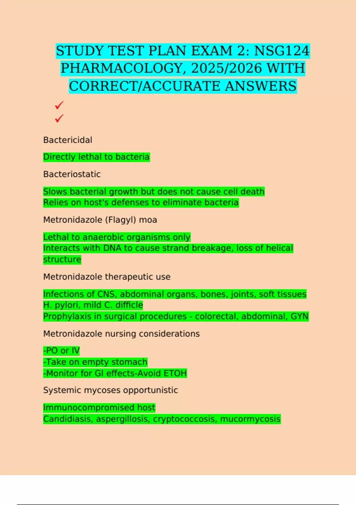 STUDY TEST PLAN EXAM 2: NSG124 PHARMACOLOGY, 2025/2026 WITH CORRECT/ACCURATE ANSWERS