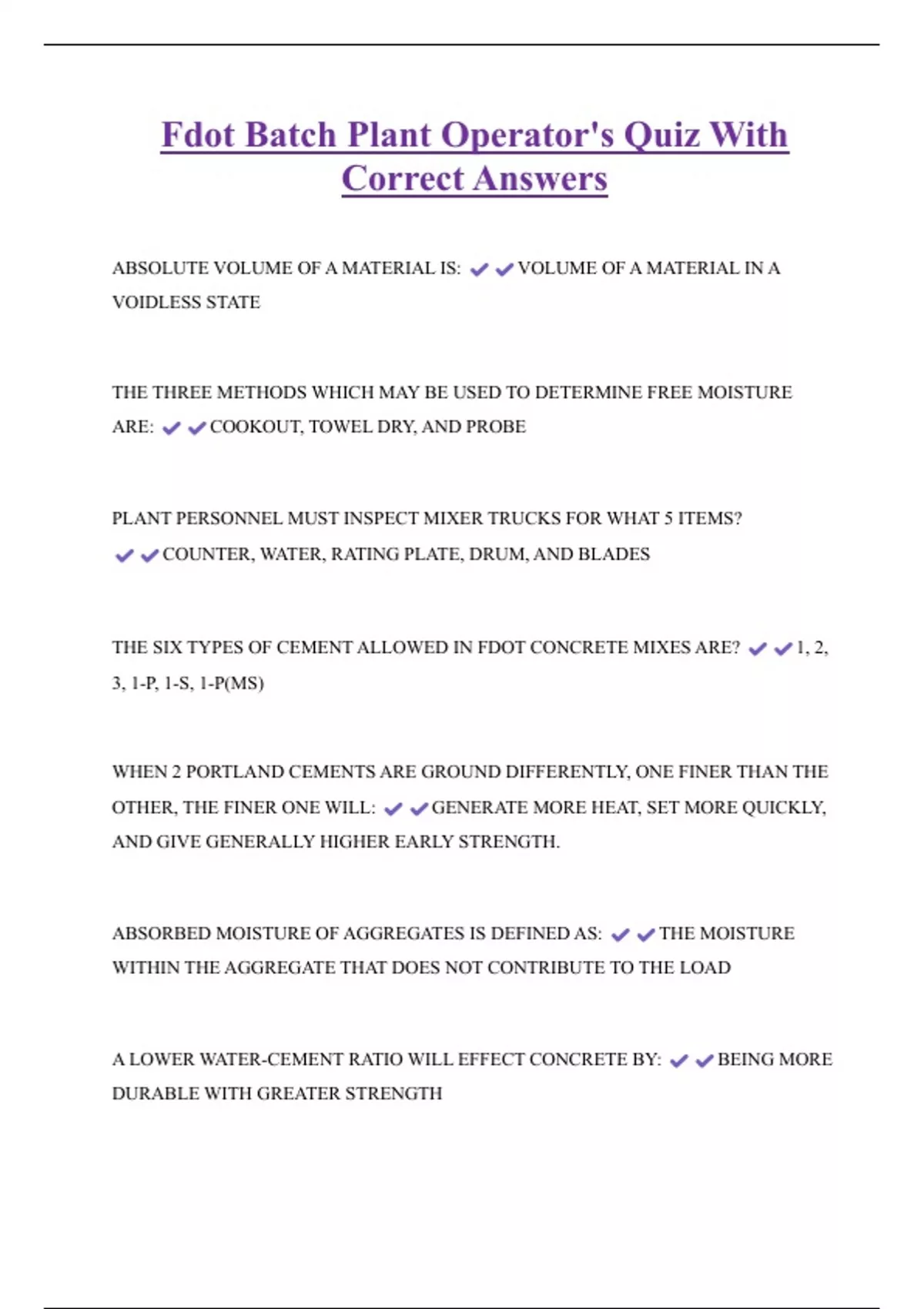 Fdot Batch Plant Operator's Quiz With Correct Answers