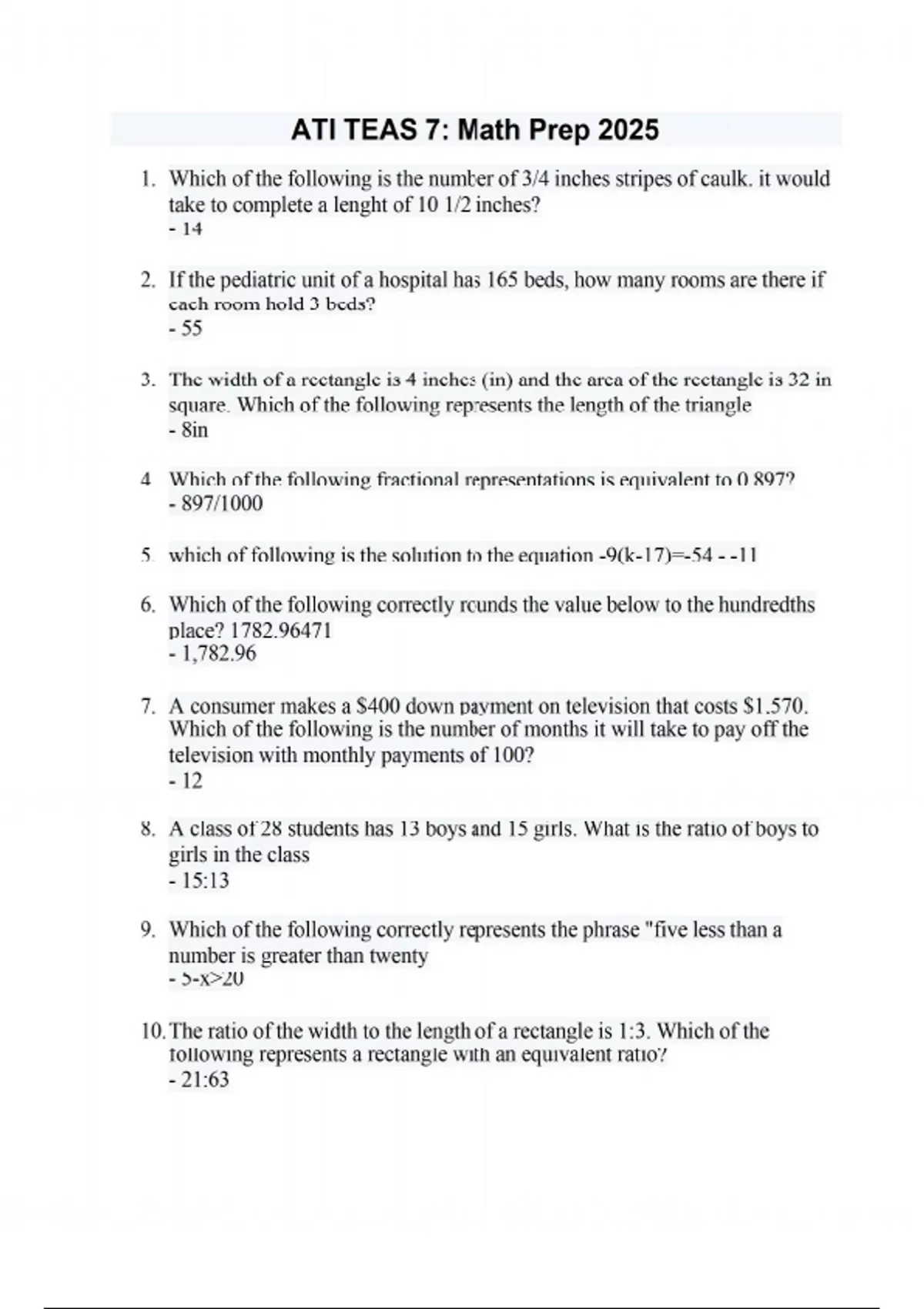 1. Which of the following is the number of 3/4 inches stripes of caulk. it would take to complete a lenght of 10 1/2 inches? - 14 2. If the pediatric unit of a hospital has 165 beds, how many rooms are there if each room hold 3 beds? - 55 3. The width of a rectangle is 4 inches (in) and the area of the rectangle is 32 in square. Which of the following represents the length of the triangle - 8in 4. Which of the following fractional representations is equivalent to 0.897? - 897/1000 5. which of following is the solution to the equation -9(k-17)=-54 - -11 6. Which of the following correctly rounds the value below to the hundredths place? 1782.96471 - 1,782.96 7. A consumer makes a $400 down payment on television that costs $1,570. Which of the following is the number of months it will take to pay off the television with monthly payments of 100? - 12 8. A class of 28 students has 13 boys and 15 girls. What is the ratio of boys to girls in the class - 15:13 9. Which of the following correctly represents the phrase "five less than a number is greater than twenty - 5-x20 10. The ratio of the width to the length of a rectangle is 1:3. Which of the following represents a rectangle with an equivalent ratio? - 21:63 11. 5/7 - 2/9 simplify the expression above. Which of the following is correct? - 31/63 12. All of the 1,020 students at a local high school must enrol in a foreign language course. If 269 students are enrolled in French, 663 are enrolled in Spanish, and the remaining students are enrolled in German, which of the following is the percent of students enrolled in German? -Round to Nearest whole number - 65 13. An investor owns 50 shares of a stock worth $15.30 per share. Which of the following is the amount of money the investor would receive if he cashed half of the shares of this stock? - $765.00 14. Which of the following is a good estimate of the length of a standard bed pillow - 0.5m 15.(½)(10t)=50,000 - 10,000 16.A glass that holds 0.5 liters (L) will hold how many milliliters (ml) - 500ml 17.A vertical 1-meter stick casts a shadow of 0.4 meters. if a tree casts a shadow of 12 meters at the same time, how tall is the tree? - 13.4 meters 18.Which of the following percentages is the discount of a textbook if the original price is $107.00 and the discount is $62.10? (round to the nearest whole percentage) - 45% 19.(3/7),(⅖),(½),(⅓)Using the numbers above, which of the following numbers is the least? - 1/3 20. Which of the following correctly rounds the value below to the hundredths place?1782.96471 - 1,782.96 21. Five hundred forty-eight runners participated in a recent y-six runners did not finish the race. Half of those who did not finish completed the race in less than two hours. Which of the following is the number of runners who completed the race in less than two hours? - 261 22. Which of the following options represents 27% of 54? - 14.58 23. A pudding recipe for 50 people calls for 4 cups of sugar. Each bag of sugar contains 6 cups. How many bags of sugar will be needed to make this recipe for 300 people? - 4 bags 24. _4(⅙)+1(⅓)_Simplify the expression above. Which of the following is correct? - 4(1/2) 25. A lab scale weighs 3 pounds, 5 ounces. Which of the following is the scale's weight in (oz) - 53 oz 26. A temperature gauge reads 95͑ F. Which of the following is the correct conversion to degrees celsius? (note: C=(5/9)(F-32)) - 35 C 27. The number of bicycles(X) in a shop is 4 more than 3 times the number of snowmobile(y) which of the represents the number of bicycles in terms of snowmobiles - X=3y+4 28. An employee discovers that 0.0025 of all products predicted at his factory contain defects, which of the following % does this represent? - 0.25% 29. Simplify the expression above, which one is correct? (2x + 5)(4x-7) - 8x^2 + 6 - 35