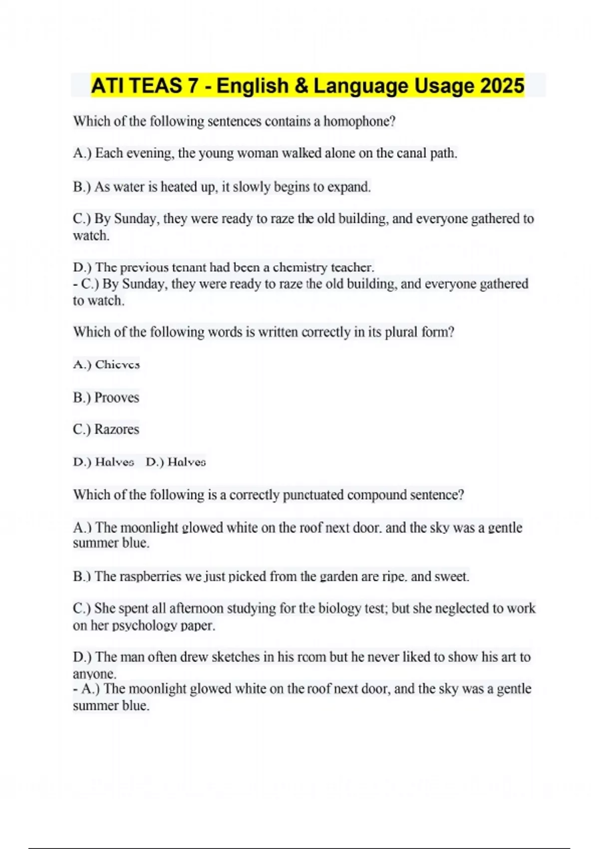 Which of the following sentences contains a homophone? A.) Each evening, the young woman walked alone on the canal path. B.) As water is heated up, it slowly begins to expand. C.) By Sunday, they were ready to raze the old building, and everyone gathered to watch. D.) The previous tenant had been a chemistry teacher. - C.) By Sunday, they were ready to raze the old building, and everyone gathered to watch. Which of the following words is written correctly in its plural form? A.) Chieves B.) Prooves C.) Razores D.) Halves - D.) Halves Which of the following is a correctly punctuated compound sentence? A.) The moonlight glowed white on the roof next door, and the sky was a gentle summer blue. B.) The raspberries we just picked from the garden are ripe, and sweet. C.) She spent all afternoon studying for the biology test; but she neglected to work on her psychology paper. D.) The man often drew sketches in his room but he never liked to show his art to anyone. - A.) The moonlight glowed white on the roof next door, and the sky was a gentle summer blue. Which of the following demonstrates correct punctuation of a quotation? A.) "You should have never invited Shane to that party," said Jessica, "if you didn't want him to run into Blayne." B.) "You should have never invited Shane to that party," said Jessica. "If you didn't want him to run into Blayne." C.) You should have never invited Shane to that party," said Jessica "if you didn't want him to run into Blayne." D.) "You should have never invited Shane to that party," said Jessica, "If you didn't want him to run into Blayne." - A.) "You should have never invited Shane to that party," said Jessica, "if you didn't want him to run into Blayne." Which of the following punctuation marks correctly completes the sentence below? I need an assistant who can do the following input data, edit reports, and maintain the website. A.) ; B.) : C.) , D.) . - B.) : Which of the following punctuation marks is used incorrectly in the sentence below? She put down her glasses, and her book; the train was starting to enter the long, dark tunnel. A.) The semicolon after "book" B.) The comma after "long" C.) The comma after "glasses" D.) The period at the end of the sentence - C.) The comma after "glasses" Please don't take what I said so personally. Which of the following parts of speech is "personally" as used in the sentence above? A.) Article B.) Adjective C.) Verb D.) Adverb - D.) Adverb He had to fill out a health history before seeing the doctor. A.) questionnaire B.) questionaire C.) questionnare D.) questionairre - A.) questionnaire Which of the following sentences contains an indirect object? A.) Melissa walked to the grocery store for milk. B.) Dante skimmed the magazine while waiting in the lobby. C.) Jorge assigned the class some math problems. D.) Sara went to the movie with Amal. - C.) Jorge assigned the class some math problems. The plump old white cat basked in the warm sunlight. Which of the following options correctly punctuates the sentence above? A.) The plump, old, white cat basked in the warm sunlight B.) The plump, old, white, cat basked in the warm sunlight C.) The plump, old white cat basked in the warm sunlight. D.) The plump old white cat, basked in the warm sunlight. - A.) The plump, old, white cat basked in the warm sunlight. Which of the following words is spelled correctly? A.) Miniscool B.) Minature C.) Maintainance D.) Millennium - D.) Millennium Which of the following options contains a possessive pronoun? A.) If the patient chooses to leave, let them know the right to do so is theirs. B.) When we support patients in these ways, the hospital's mission is accomplished. C.) Take personal items to the front desk once you are finished. D.) This hospital has some problems, no doubt. - A.) If the patient chooses to leave, let them know the right to do so is theirs. Which of the following sentences from a paragraph about gingivitis is the topic sentence? A.) Gingivitis can be reversed by daily brushing, flossing, and regular dental cleanings. B.) Gingivitis is a mild form of gum disease, in which bacteria causes inflammation of the gums. C.) With gingivitis, the gums become red and swollen and van bleed easily. D.) If left untreated, gingivitis can cause periodontitis, in which the gums pull away from the teeth, and can eventually lead to infection and bone loss. - B.) Gingivitis is a mild form of gum disease, in which bacteria causes inflammation of the gums. Which of the following sentences from a paragraph about yoga is the topic sentence? A.) The word "yoga" was mentioned in the Vedas, a collection of texts containing songs, mantras, and rituals used by Vedic priests. B.) By the late 1800s, yoga masters from India began to travel to the West, attracting followers. C.) After a few hundred years, Yoga masters rejected the teachings of the ancient Vedas and embraced the physical body as the means to achieve enlightenment. D.) The practice of yoga first developed in the Indus-Sarasvati civilization in Northern India over 5,000 years ago. - D.) The practice of yoga first developed in the Indus-Sarasvati civilization in Northern India over 5,000 years ago. Which of the following examples from the paragraph about the Silk Road is a transition sentence? A.) The Silk Road got its name from Chinese silk, which was a major item traded along the route. B.) However, there were many other important trade items, some of which would end up changing the world forever. C.) Because the Silk Road was not just one single road, historians also use the term "Silk Routes" to describe the network. D.) The Silk Road was an ancient network of trade routes that stretched from China through India all the way to Africa, Greece, Rome, and Great Britain. - B.) However, there were many other important trade items, some of which would end up changing the world forever. Which of the following is the correct sequence to place the following sentences to construct a well