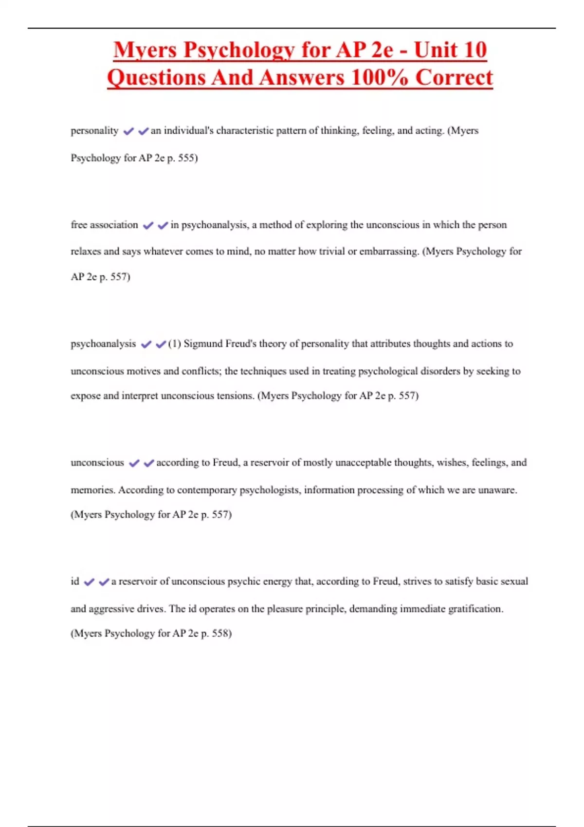 Myers Psychology for AP 2e - Unit 10 Questions And Answers 100% Correct personality an individual's characteristic pattern of thinking, feeling, and acting. (Myers Psychology for AP 2e p. 555) free association in psychoanalysis, a method of exploring the unconscious in which the person relaxes and says whatever comes to mind, no matter how trivial or embarrassing. (Myers Psychology for AP 2e p. 557)