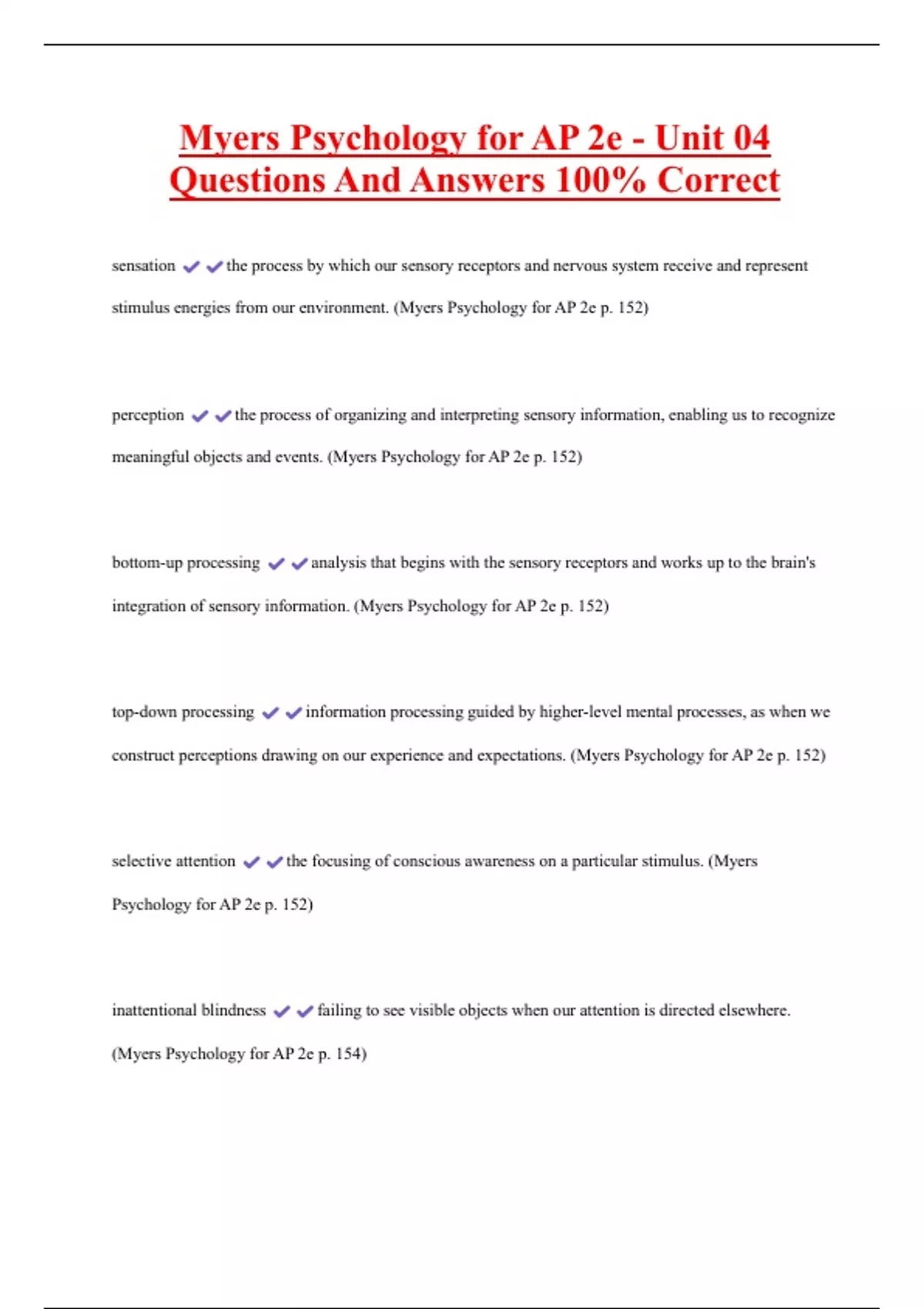 Myers Psychology for AP 2e - Unit 04 Questions And Answers 100% Correct sensation the process by which our sensory receptors and nervous system receive and represent stimulus energies from our environment. (Myers Psychology for AP 2e p. 152) perception the process of organizing and interpreting sensory information, enabling us to recognize meaningful objects and events. (Myers Psychology for AP 2e p. 152) bottom-up processing analysis that begins with the sensory receptors and works up to the brain's integration of sensory information. (Myers Psychology for AP 2e p. 152)