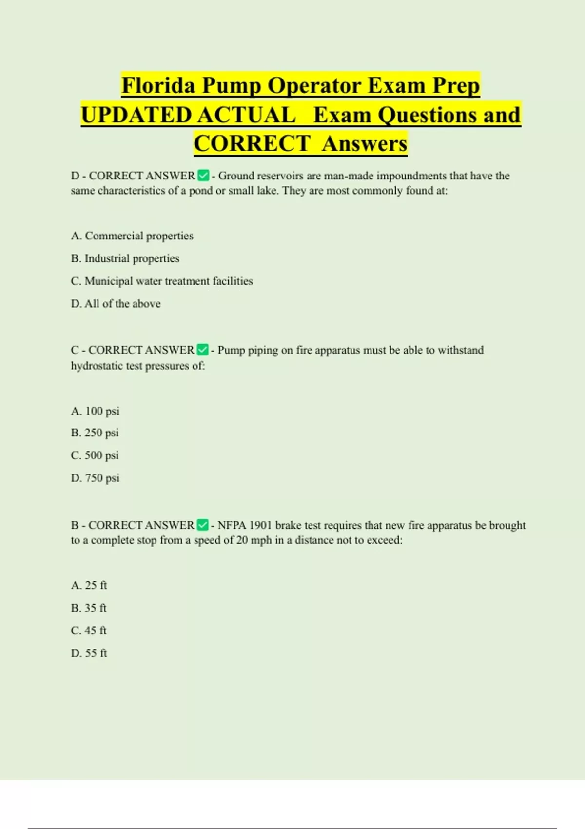 Florida Pump Operator Exam Prep UPDATED ACTUAL Exam Questions and CORRECT Answers D - CORRECT ANSWER - Ground reservoirs are man-made impoundments that have the same characteristics of a pond or small lake. They are most commonly found at: A. Commercial properties B. Industrial properties C. Municipal water treatment facilities D. All of the above