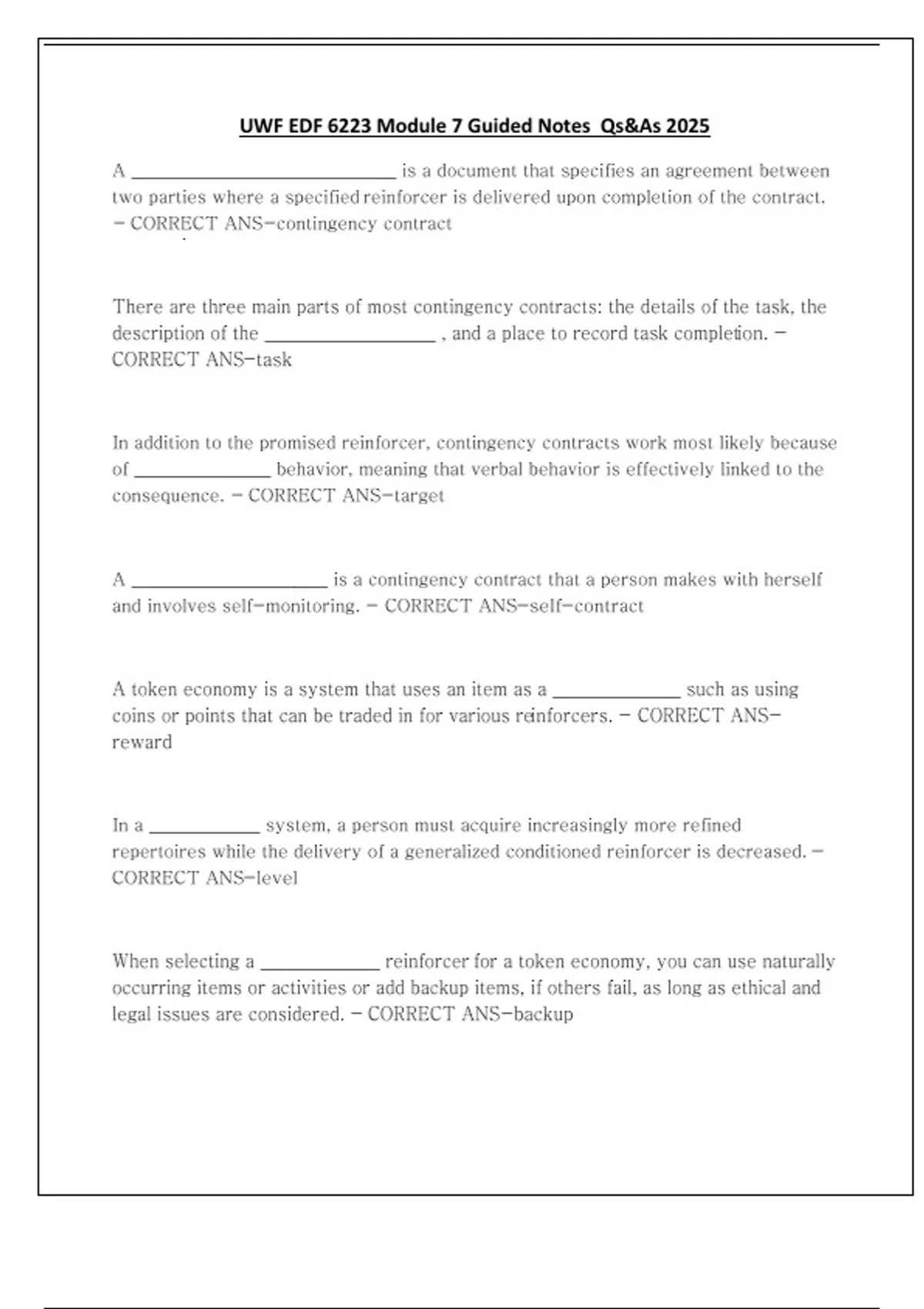 UWF EDF 6223 Module 7 Guided Notes Qs&As 2025 A _______________________________ is a document that specifies an agreement between two parties where a specified reinforcer is delivered upon completion of the contract. - CORRECT ANS-contingency contract There are three main parts of most contingency contracts: the details of the task, the description of the ____________________ , and a place to record task completion. - CORRECT ANS-task In addition to the promised reinforcer, contingency contracts work most likely because of ________________ behavior, meaning that verbal behavior is effectively linked to the consequence. - CORRECT ANS-target A _______________________ is a contingency contract that a person makes with herself and involves self-monitoring. - CORRECT ANS-self-contract A token economy is a system that uses an item as a _______________ such as using coins or points that can be traded in for various reinforcers.