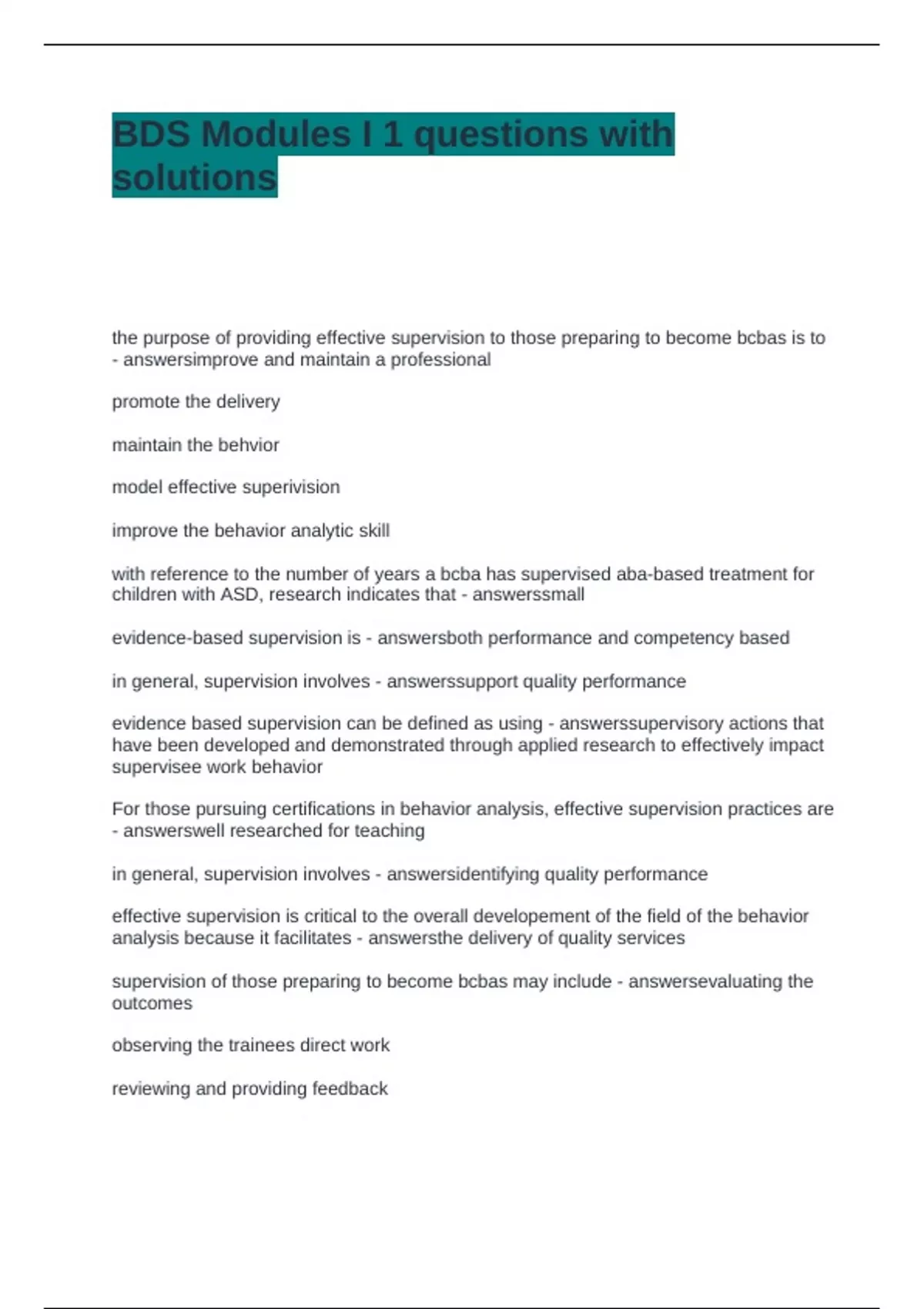the purpose of providing effective supervision to those preparing to become bcbas is to - answersimprove and maintain a professional promote the delivery maintain the behvior model effective superivision improve the behavior analytic skill with reference to the number of years a bcba has supervised aba-based treatment for children with ASD, research indicates that - answerssmall evidence-based supervision is - answersboth performance and competency based in general, supervision involves - answerssupport quality performance evidence based supervision can be defined as using - answerssupervisory actions that have been developed and demonstrated through applied research to effectively impact supervisee work behavior For those pursuing certifications in behavior analysis, effective supervision practices are - answerswell researched for teaching in general, supervision involves - answersidentifying quality performance effective supervision is critical to the overall developement of the field of the behavior analysis because it facilitates - answersthe delivery of quality services supervision of those preparing to become bcbas may include - answersevaluating the outcomes observing the trainees direct work reviewing and providing feedback