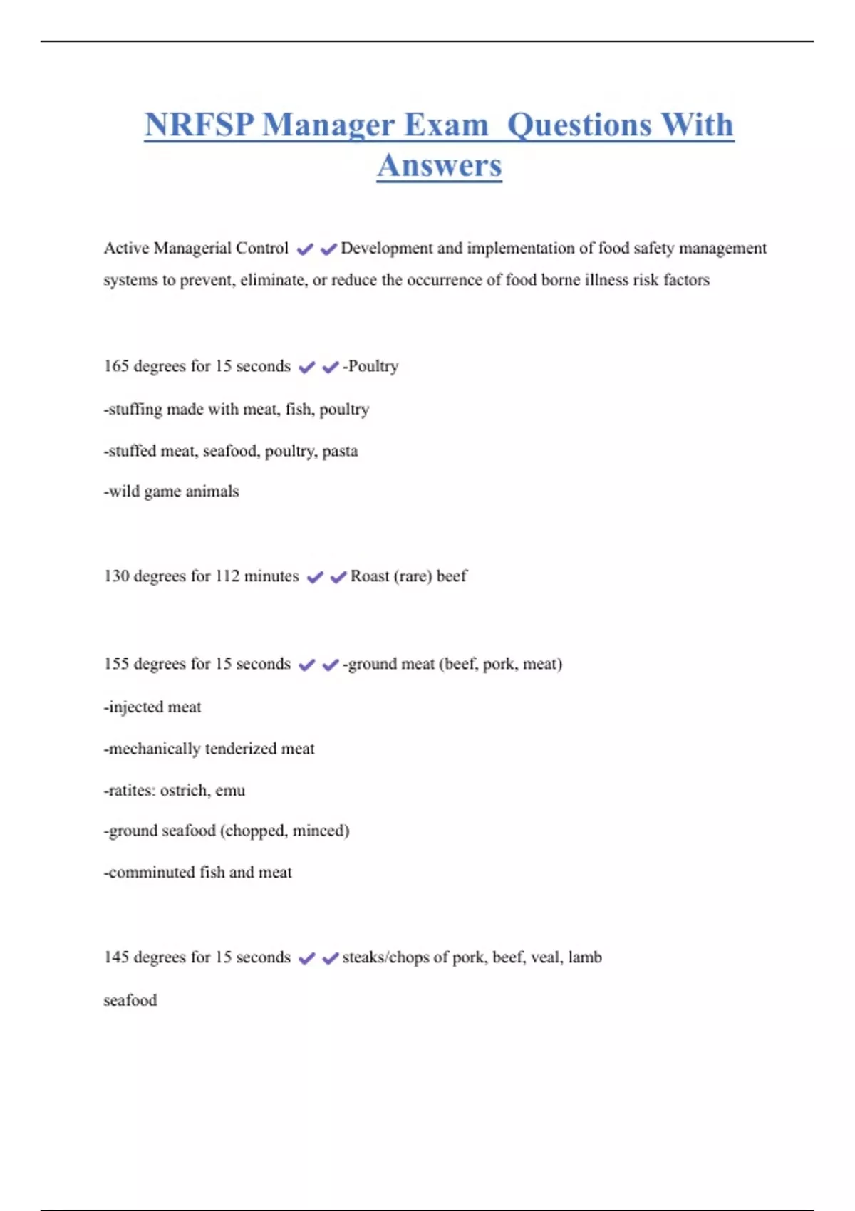 NRFSP Manager Exam Questions With Answers Active Managerial Control Development and implementation of food safety management systems to prevent, eliminate, or reduce the occurrence of food borne illness risk factors 165 degrees for 15 seconds -Poultry -stuffing made with meat, fish, poultry -stuffed meat, seafood, poultry, pasta -wild game animals