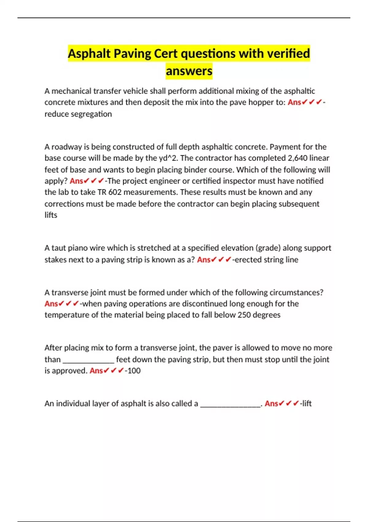 Asphalt Paving Cert questions with verified answers