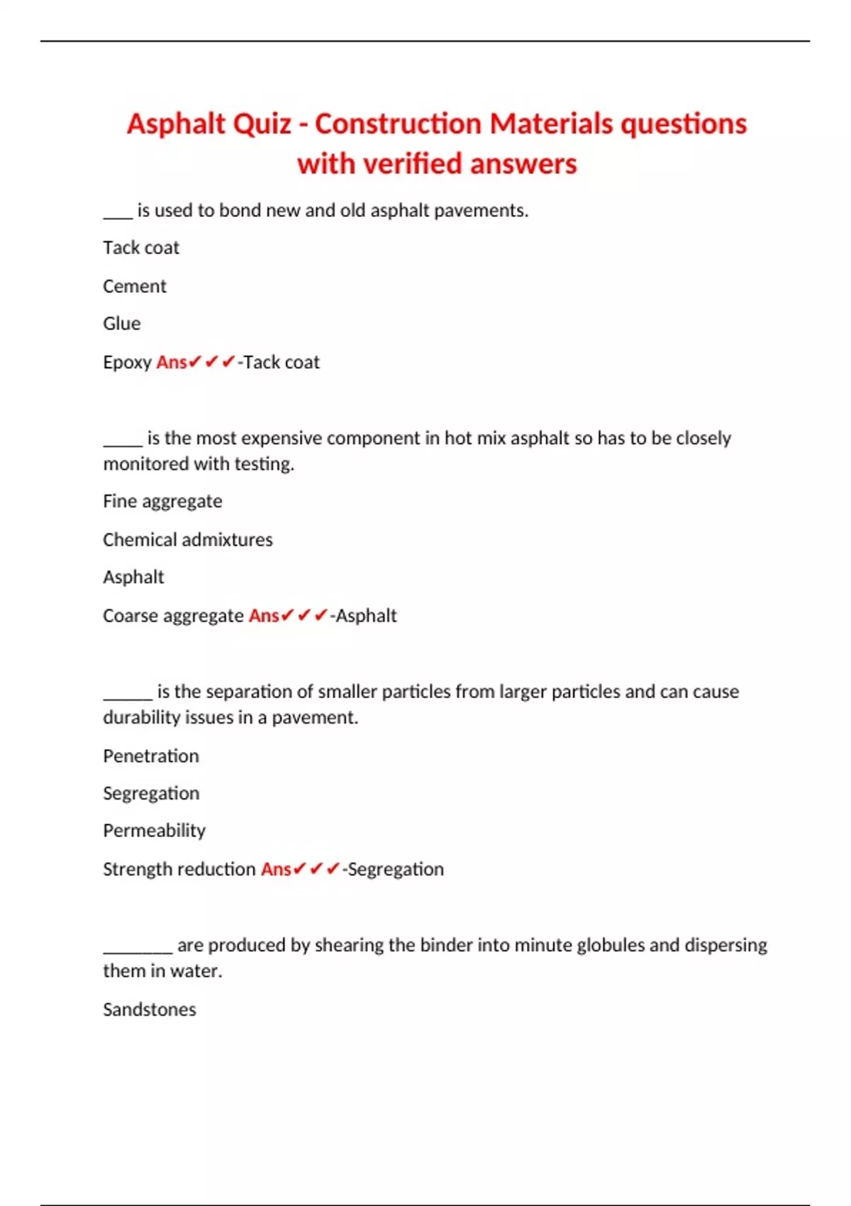 ___ is used to bond new and old asphalt pavements. Tack coat Cement Glue Epoxy Ans-Tack coat ____ is the most expensive component in hot mix asphalt so has to be closely monitored with testing. Fine aggregate Chemical admixtures Asphalt Coarse aggregate Ans-Asphalt _____ is the separation of smaller particles from larger particles and can cause durability issues in a pavement. Penetration Segregation Permeability Strength reduction Ans-Segregation _______ are produced by shearing the binder into minute globules and dispersing them in water. Sandstones Asphalt emulsions