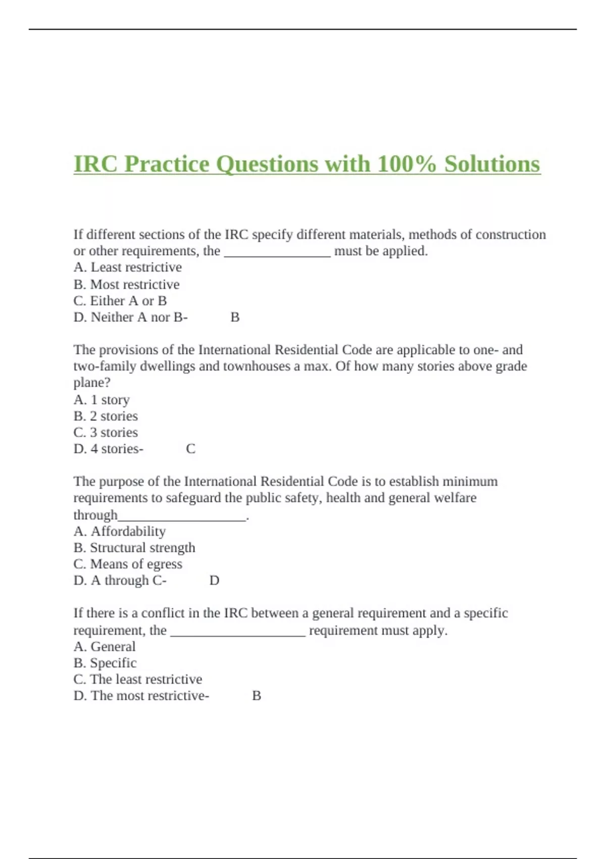 If different sections of the IRC specify different materials, methods of construction or other requirements, the _______________ must be applied. A. Least restrictive B. Most restrictive C. Either A or B D. Neither A nor B- B The provisions of the International Residential Code are applicable to one- and two-family dwellings and townhouses a max. Of how many stories above grade plane? A. 1 story B. 2 stories C. 3 stories D. 4 stories- C The purpose of the International Residential Code is to establish minimum requirements to safeguard the public safety, health and general welfare through__________________. A. Affordability B. Structural strength C. Means of egress D. A through C- D If there is a conflict in the IRC between a general requirement and a specific requirement, the ___________________ requirement must apply. A. General B. Specific C. The least restrictive D. The most restrictive- B If the enforcement of a code provision violates the conditions of the listing of a/an _____________________, then the condition of the listing and manufacturer's instructions must apply. A. Equipment B. Appliance C. Both A and B D. Neither A nor B- A, B, C