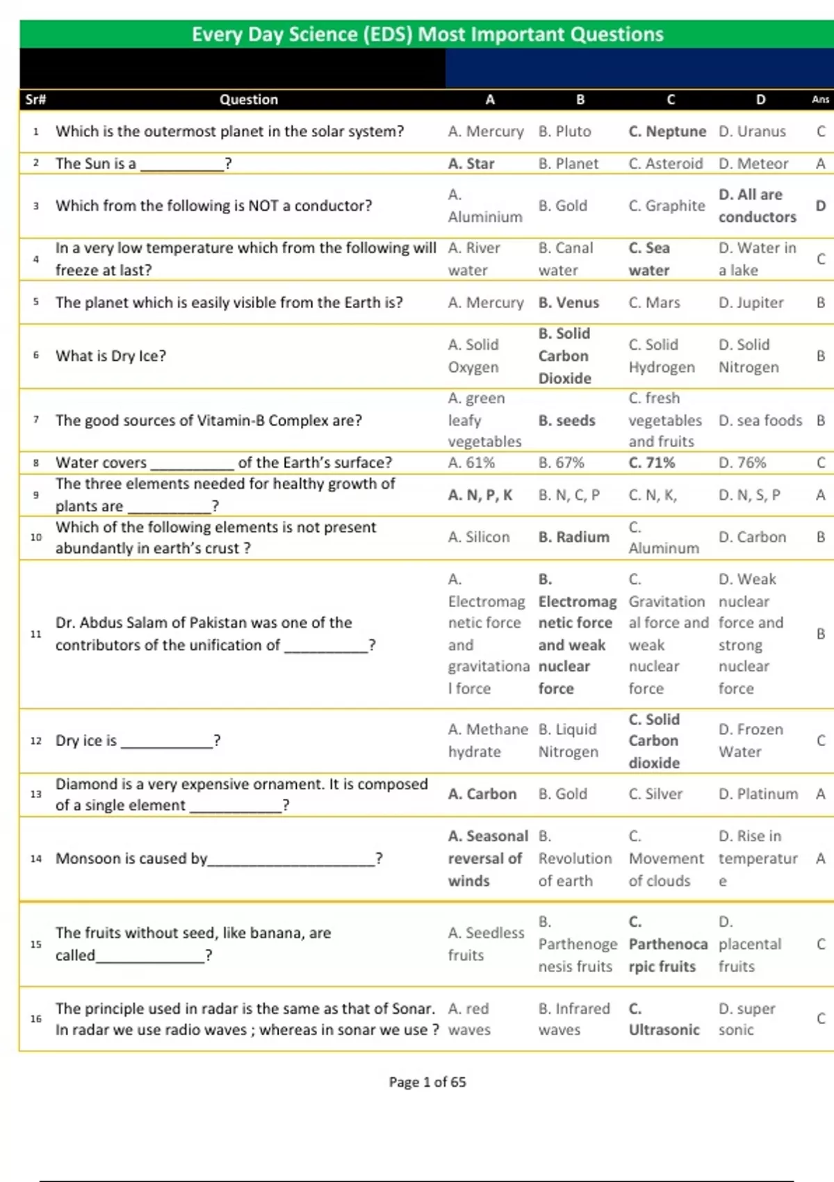 Sr# Question A B C D Ans