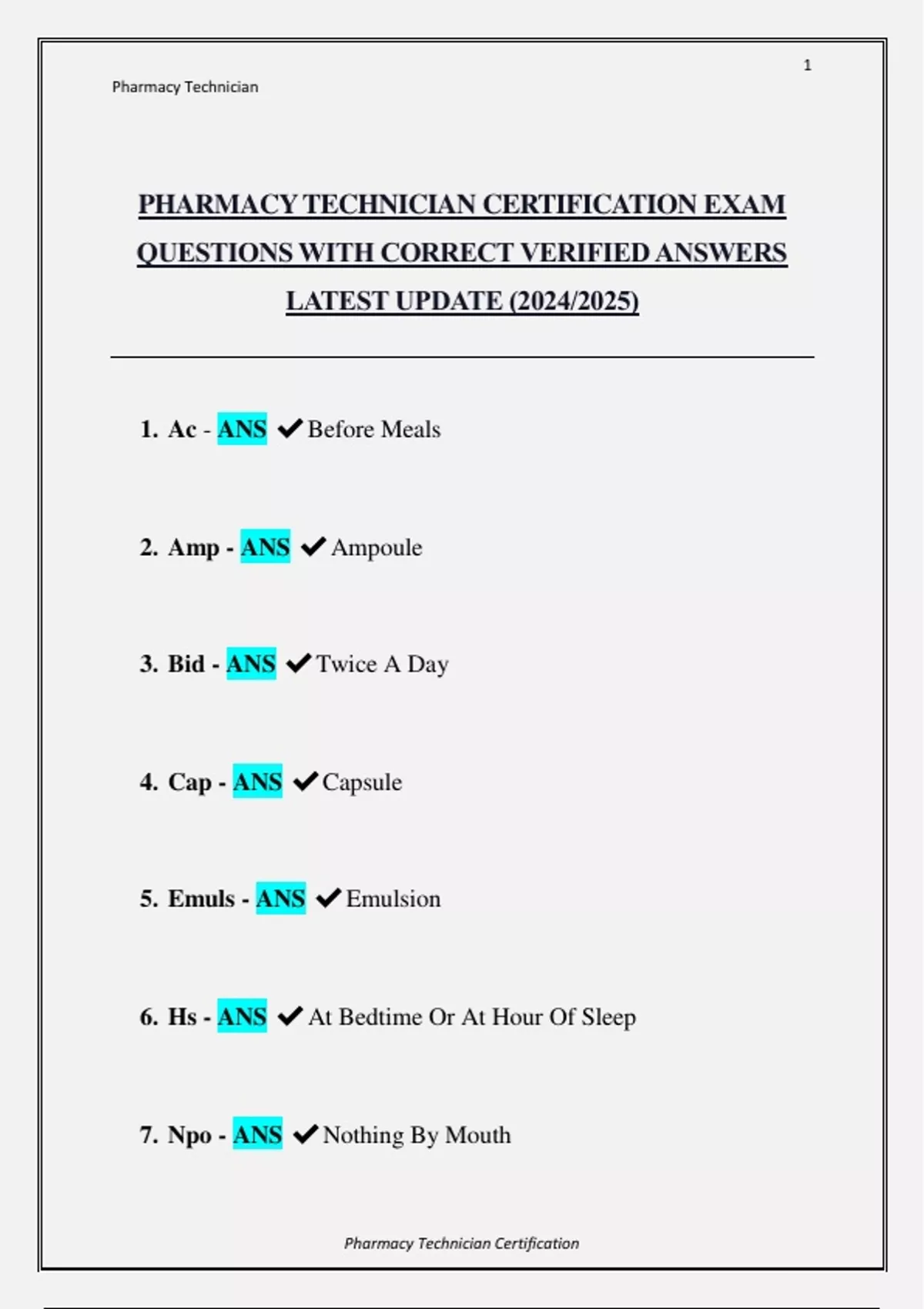 PHARMACY TECHNICIAN CERTIFICATION EXAM QUESTIONS WITH CORRECT VERIFIED ANSWERS LATEST UPDATE (2024/2025)
