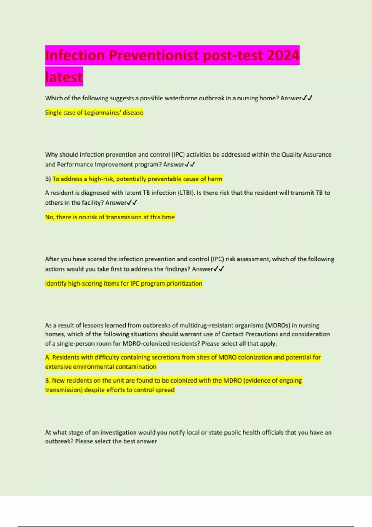 Which of the following suggests a possible waterborne outbreak in a nursing home? Answer Single case of Legionnaires' disease Why should infection prevention and control (IPC) activities be addressed within the Quality Assurance and Performance Improvement program? Answer B) To address a high-risk, potentially preventable cause of harm A resident is diagnosed with latent TB infection (LTBI). Is there risk that the resident will transmit TB to others in the facility? Answer No, there is no risk of transmission at this time After you have scored the infection prevention and control (IPC) risk assessment, which of the following actions would you take first to address the findings? Answer Identify high-scoring items for IPC program prioritization