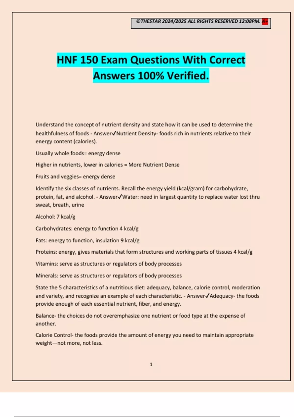 ©THESTAR 2024/2025 ALL RIGHTS RESERVED 12:08PM. A+ 1 HNF 150 Exam Questions With Correct Answers 100% Verified. Understand the concept of nutrient density and state how it can be used to determine the healthfulness of foods - AnswerNutrient Density- foods rich in nutrients relative to their energy content (calories). Usually whole foods= energy dense Higher in nutrients, lower in calories = More Nutrient Dense Fruits and veggies= energy dense Identify the six classes of nutrients. Recall the energy yield (kcal/gram) for carbohydrate, protein, fat, and alcohol. - AnswerWater: need in largest quantity to replace water lost thru sweat, breath, urine Alcohol: 7 kcal/g Carbohydrates: energy to function 4 kcal/g Fats: energy to function, insulation 9 kcal/g Proteins: energy, gives materials that form structures and working parts of tissues 4 kcal/g Vitamins: serve as structures or regulators of body processes Minerals: serve as structures or regulators of body processes State the 5 characteristics of a nutritious diet: adequacy, balance, calorie control, moderation and variety, and recognize an example of each characteristic. - AnswerAdequacy- the foods provide enough of each essential nutrient, fiber, and energy. Balance- the choices do not overemphasize one nutrient or food type at the expense of another. Calorie Control- the foods provide the amount of energy you need to maintain appropriate weight—not more, not less. ©THESTAR 2024/2025 ALL RIGHTS RESERVED 12:08PM. A+ 2 Moderation- the foods do not provide an excess of fat, salt, sugar, or other unwanted "empty calorie" constituents. Not eating far too much or far too little. Variety- the foods chosen differ from one day to the next. Identify the steps of the scientific method. - Answer List the 5 characteristics scientists evaluate when weighing the totality of evidence about a specific nutrition question. - AnswerConsistency Strength (Strong correlations) Biologically plausible Dose dependent Specifc Describe and recognize an example of the major types of research studies. - AnswerCase studies Studies of individuals Epidemiological studies Study of populations For example, migrations studies that follow populations from one food environment to another (whole diet patterns) Types -Cross-sectional- measuring disease/condition at one time point between two or more groups -Case-control- identifying cases (those with disease/condition) and comparing to controls (those without disease/condition) -Cohort- following healthy population to see how many develop disease/condition Intervention Studies (Controlled/Clinical Trials) Researchers actively intervene in one group of the population (experimental group) and compare to a group that does not receive the intervention (control group) Laboratory studies Studies performed under tightly controlled situations; often involve animals List the health properties of garlic, and which compounds are responsible for the health benefits and odor. - AnswerContains sulfur compounds which are released when garlic is crushed or cut. ©THESTAR 2024/2025 ALL RIGHTS RESERVED 12:08PM. A+ 3 Sulfur compounds are responsible for odor and healing properties. Garlic is antimicrobial, antifungal, and antithrombotic, (prevents blood clots) Rich in calcium, phosphorus, iron, thiamin, and Vitamin C Garlic and onions enhance the absorption of iron and zinc bound up by phytate in whole grains. Identify credible sources and credentials of experts in the field of nutrition who provide reliable nutrition information. - AnswerProfessional health organization (american dietetic association, American Cancer Society), government health agencies(FDA/USDA/DHHS), certain consumer watchdog agencies (national council against health fraud), reputable consumer groups (better business bureau) Scientific study published in a peer review journal, news report that accurately describes research results, report should define study subjects. Recognize cues within nutrition information that could be misleading in advertising and media. - AnswerNews media often sensationalizes single study findings and are not always trustworthy sources of nutrition information. Too good to be true, suspicions about food supply, testimonials, false credentials, unpublished studies, persecution claims, sources not cited Motive: personal gain, advertisement, latest innovation vs time-tested Whole foods (not the supermarket!) - AnswerWhole foods are unrefined (or largely unprocessed), which means that they are as close to their natural form as possible. Fresh fruits and veggies, grains, fish, meat, milk. Processed foods - AnswerProcessed foods are any food that's changed from its natural state. This can include food that was simply cut, washed, heated, pasteurized, canned, uncooked, frozen, dried, dehydrated, mixed, or packaged. Examples: Tomato sauce, smoked or canned fish, canned fruits and veggies, frozen fruits and veggies, cheddar cheese, hummus, etc. Ultra-processed foods - AnswerThey are designed by the food industry to be convenient (ready-to-consume or ready-to-heat), attractive (hyper-palatable), profitable (low-cost ingredients and long shelf life). Cakes cookies, chips, mac n cheese, frozen pizzas, frozen dinners, tater tots, fast food, etc In many parts of the world, ultra-processed food