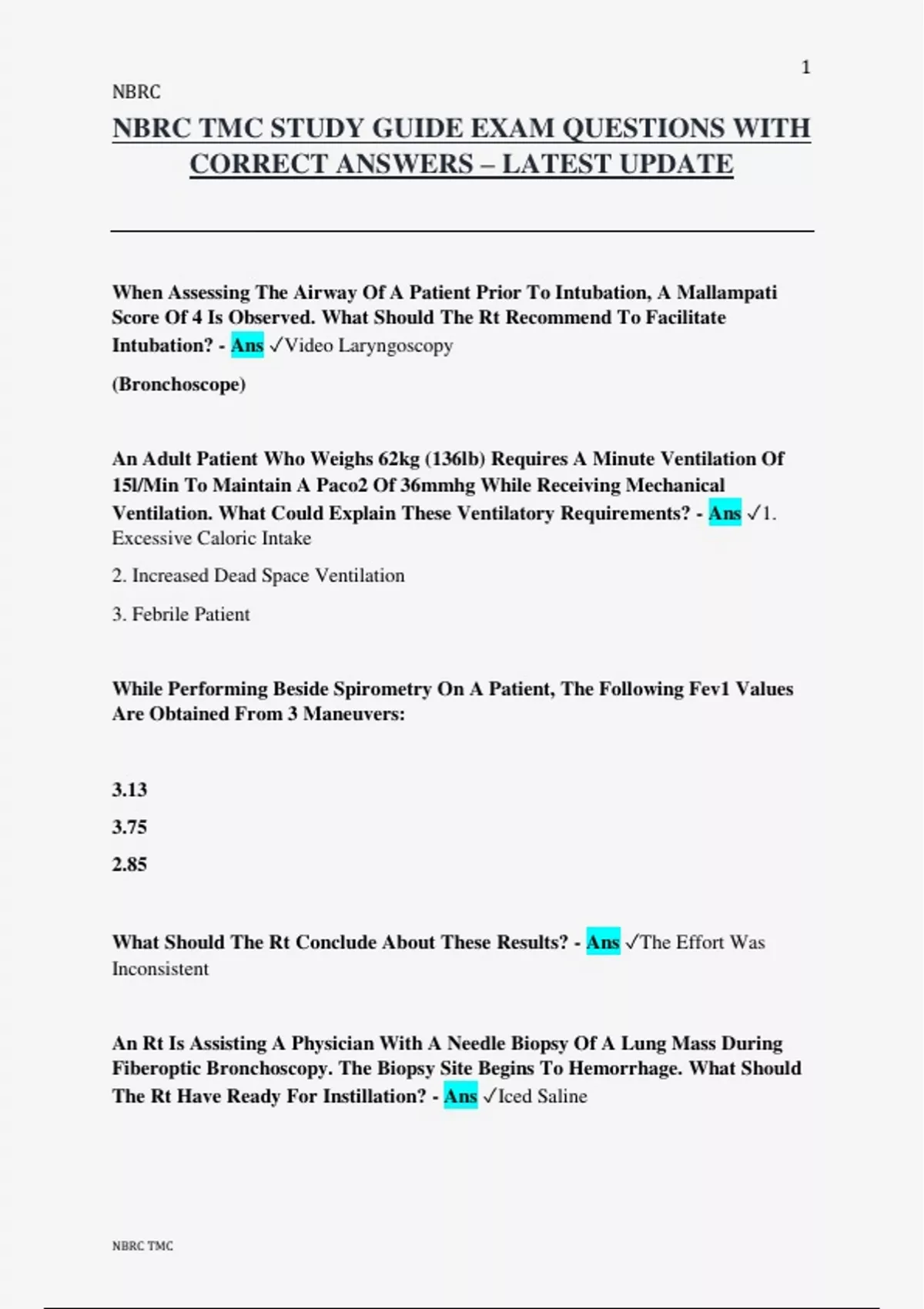 NBRC TMC STUDY GUIDE EXAM QUESTIONS WITH CORRECT ANSWERS – LATEST UPDATE
