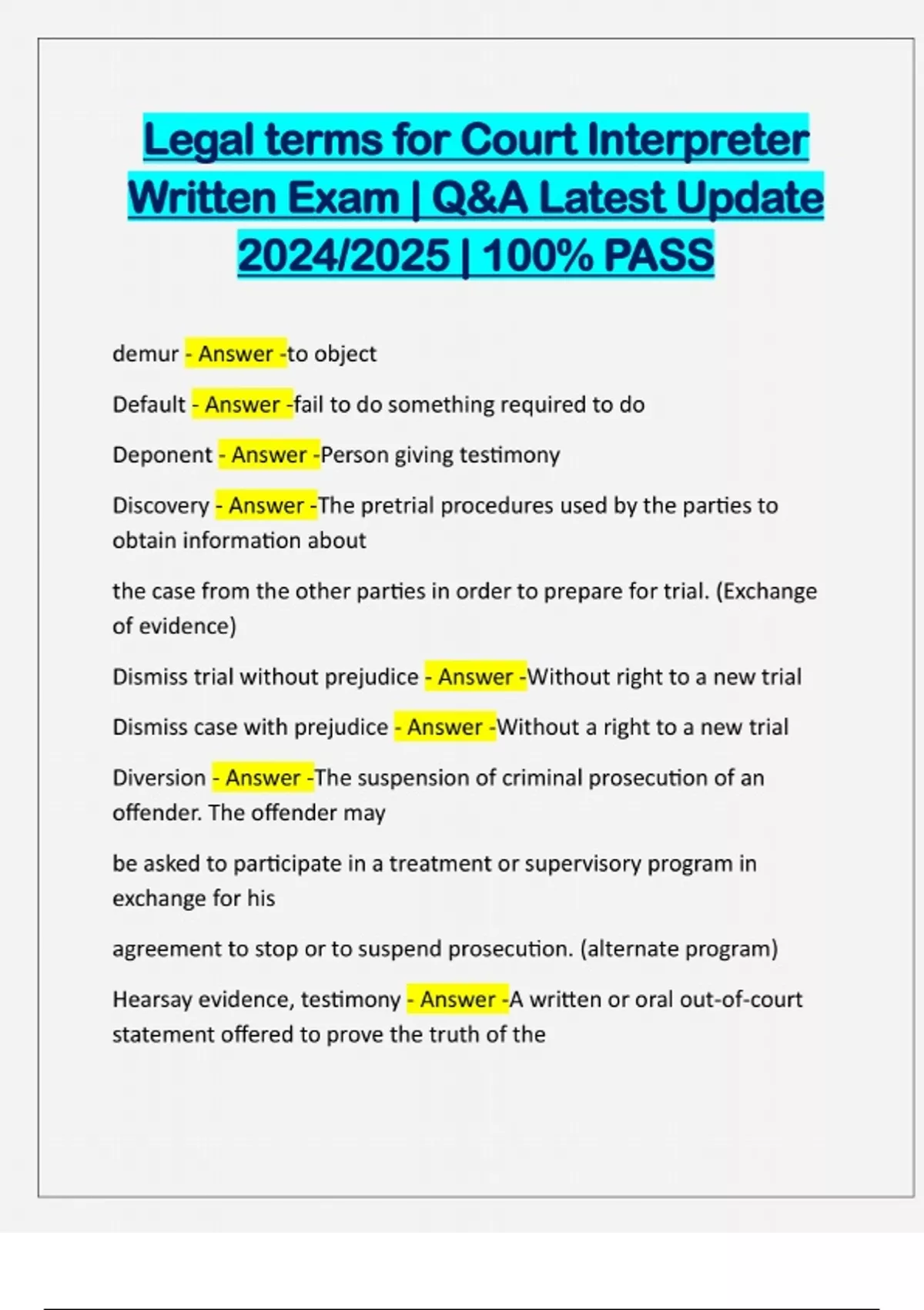 Legal terms for Court Interpreter Written Exam | Q&A Latest Update 2024/2025 | 100% PASS