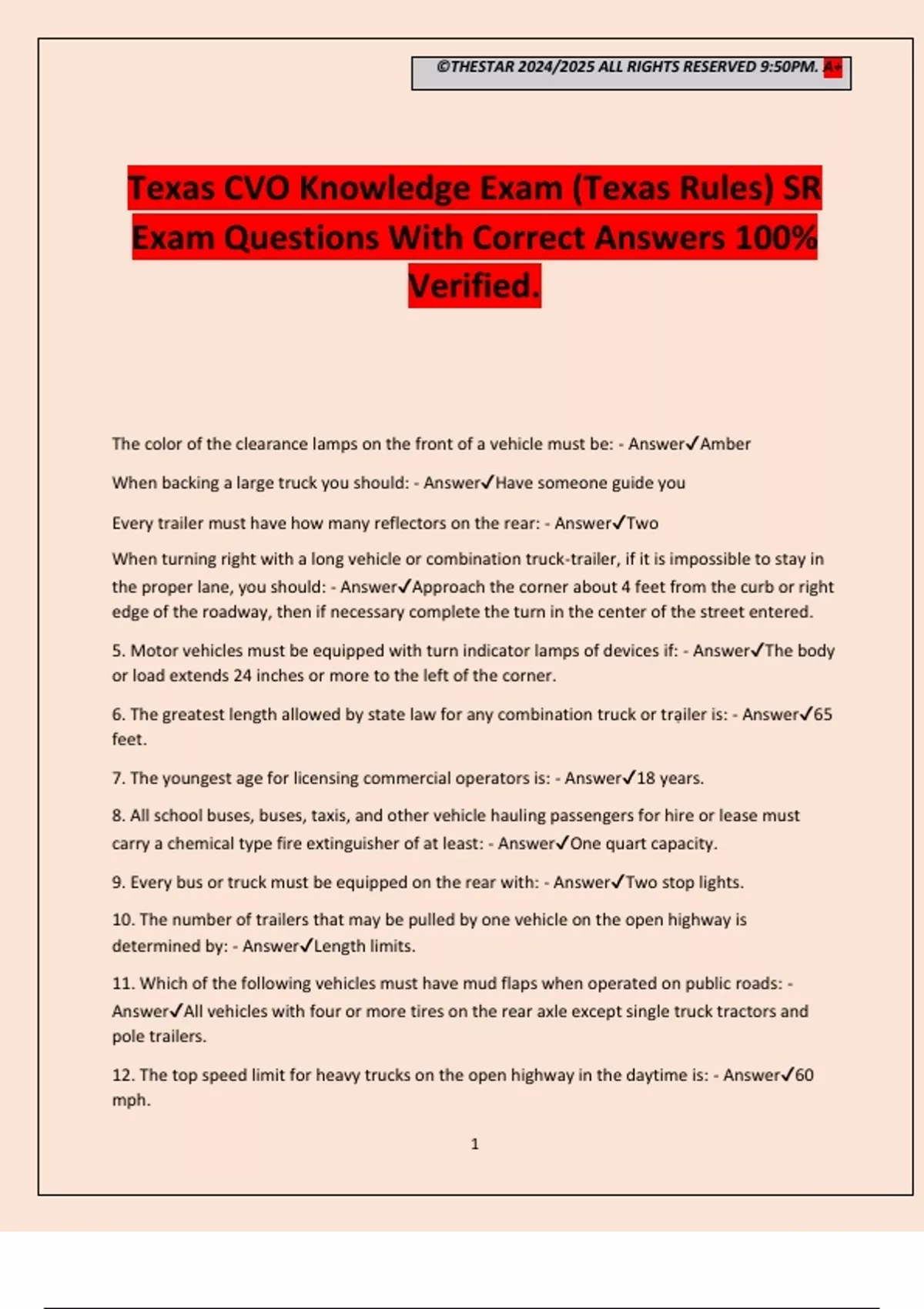 ©THESTAR 2024/2025 ALL RIGHTS RESERVED 9:50PM. A+ 1 Texas CVO Knowledge Exam (Texas Rules) SR Exam Questions With Correct Answers 100% Verified. The color of the clearance lamps on the front of a vehicle must be: - AnswerAmber When backing a large truck you should: - AnswerHave someone guide you Every trailer must have how many reflectors on the rear: - AnswerTwo When turning right with a long vehicle or combination truck-trailer, if it is impossible to stay in the proper lane, you should: - AnswerApproach the corner about 4 feet from the curb or right edge of the roadway, then if necessary complete the turn in the center of the street entered. 5. Motor vehicles must be equipped with turn indicator lamps of devices if: - AnswerThe body or load extends 24 inches or more to the left of the corner. 6. The greatest length allowed by state law for any combination truck or trạiler is: - Answer65 feet. 7. The youngest age for licensing commercial operators is: - Answer18 years. 8. All school buses, buses, taxis, and other vehicle hauling passengers for hire or lease must carry a chemical type fire extinguisher of at least: - AnswerOne quart capacity. 9. Every bus or truck must be equipped on the rear with: - AnswerTwo stop lights. 10. The number of trailers that may be pulled by one vehicle on the open highway is determined by: - AnswerLength limits. 11. Which of the following vehicles must have mud flaps when operated on public roads: - AnswerAll vehicles with four or more tires on the rear axle except single truck tractors and pole trailers. 12. The top speed limit