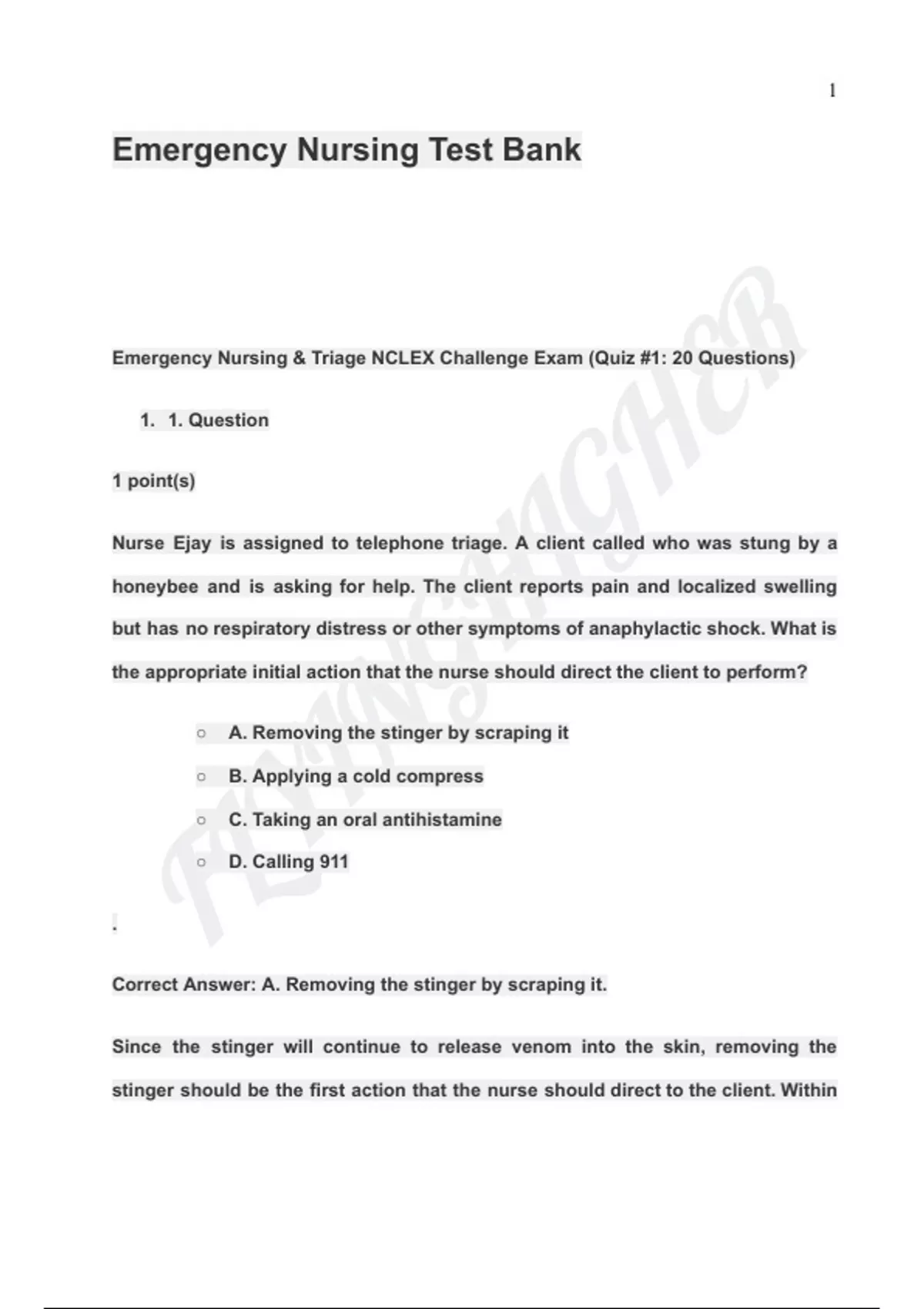 Emergency Nursing Test Bank(NCLEX reviewer and practice questions WITH RATIONALE)