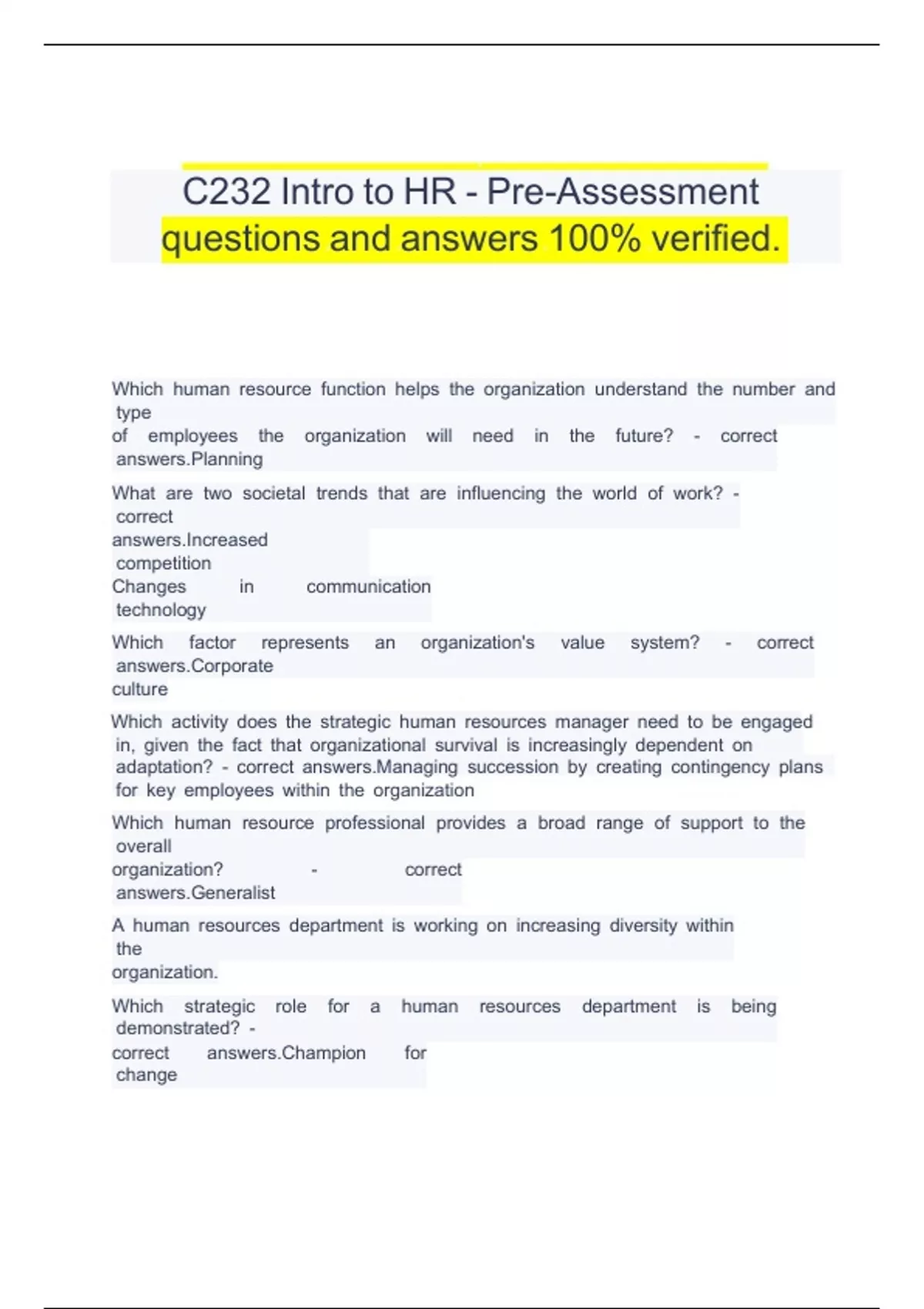 C232 Intro to HR - Pre-Assessment questions and answers 100% verified. C232 Intro to HR - Pre-Assessment questions and answers 100% verified. C232 Intro to HR - Pre-Assessment questions and answers 100% verified. C232 Intro to HR - Pre-Assessment questions and answers 100% verified. C232 Intro to HR - Pre-Assessment questions and answers 100% verified. C232 Intro to HR - Pre-Assessment questions and answers 100% verified. C232 Intro to HR - Pre-Assessment questions and answers 100% verified.