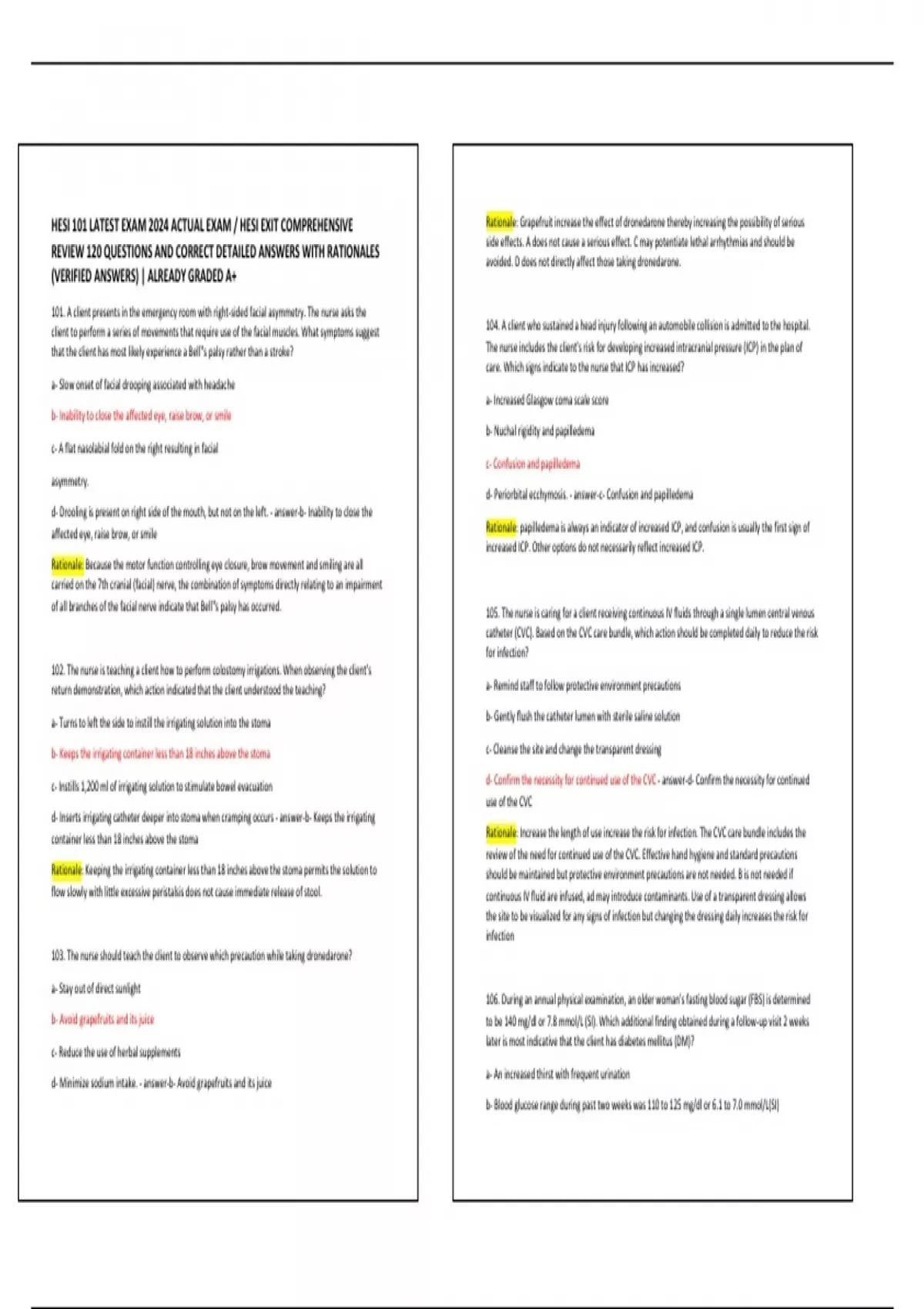 HESI 101 LATEST EXAM 2024 ACTUAL EXAM / HESI EXIT COMPREHENSIVE Rationale: Grapefruit increase the effect of dronedarone thereby increasing the possibility of serious