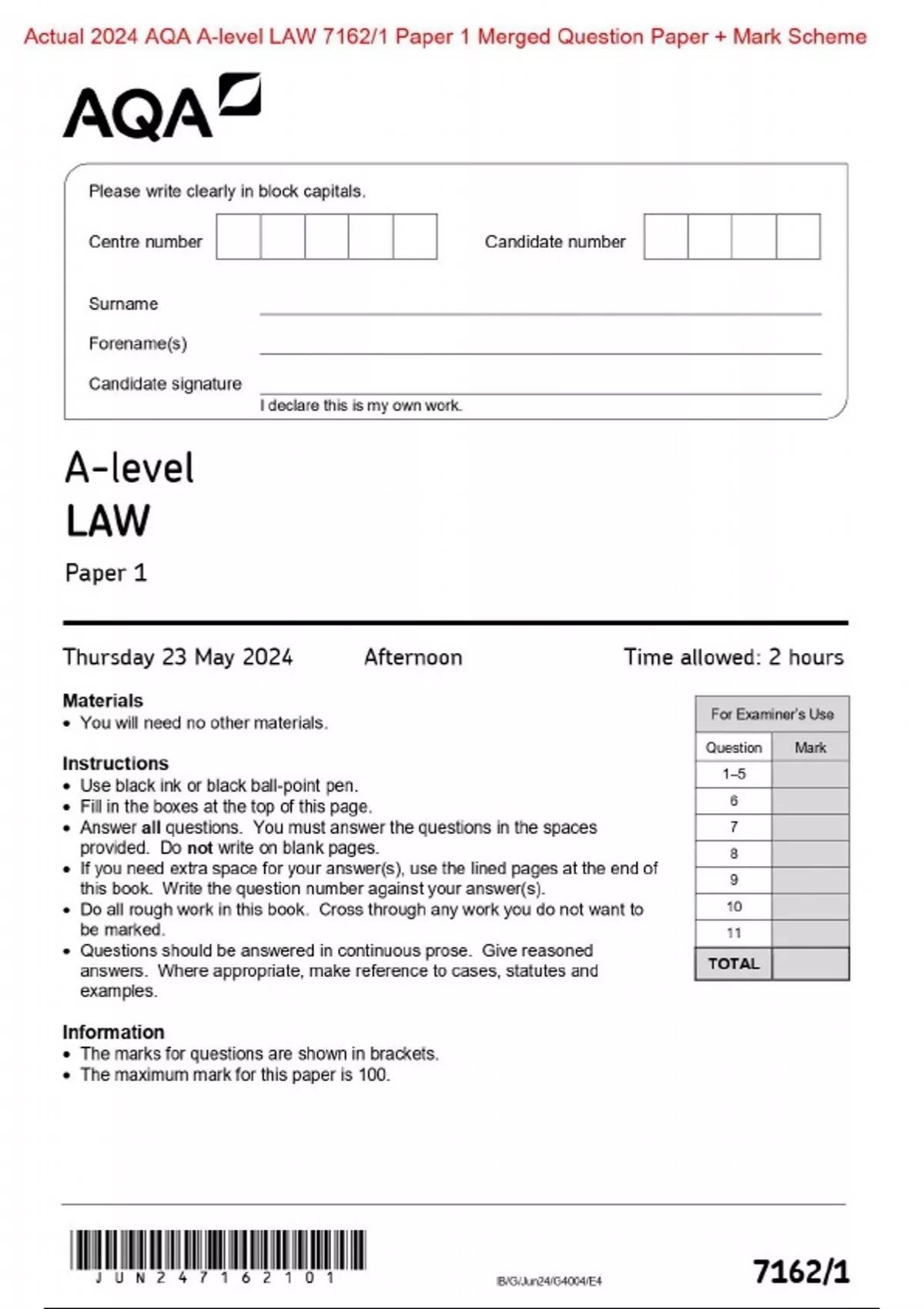 Actual 2024 AQA A-level LAW 7162/1 Paper 1 Merged Question Paper + Mark Scheme
