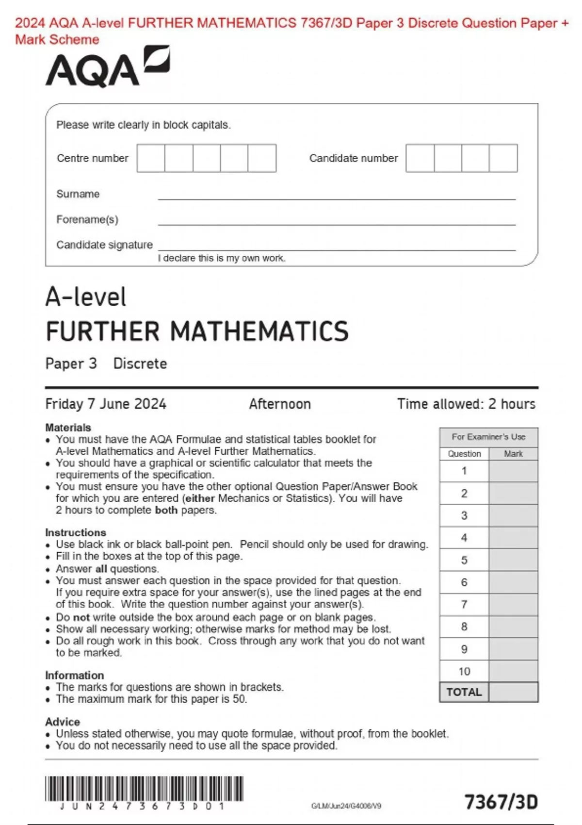 Actual 2024 AQA A-level FURTHER MATHEMATICS 7367/3D Paper 3 Discrete Merged Question Paper + Mark Scheme