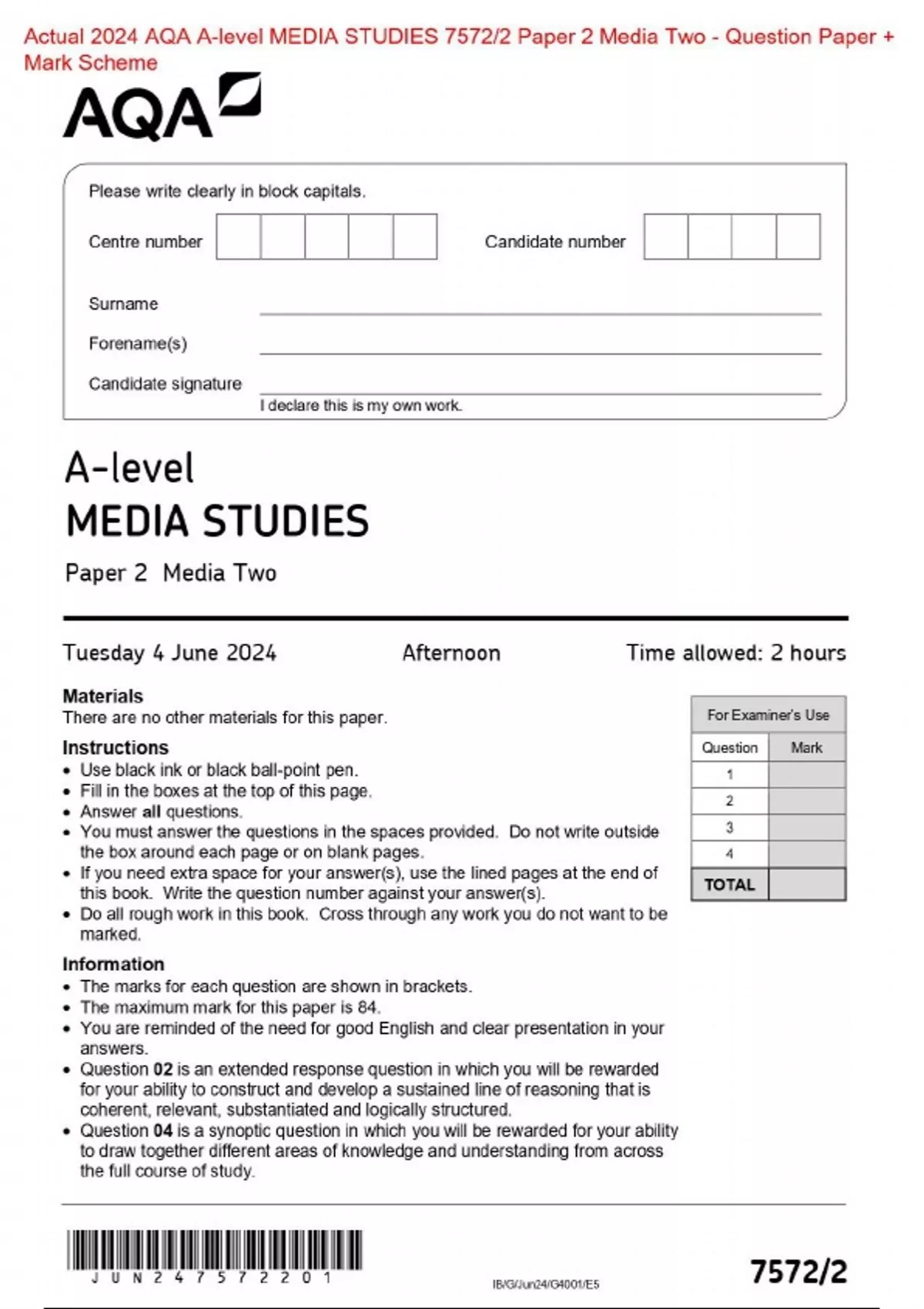 Actual 2024 AQA A-level MEDIA STUDIES 7572/2 Paper 2 Media Two Merged Question Paper + Mark Scheme