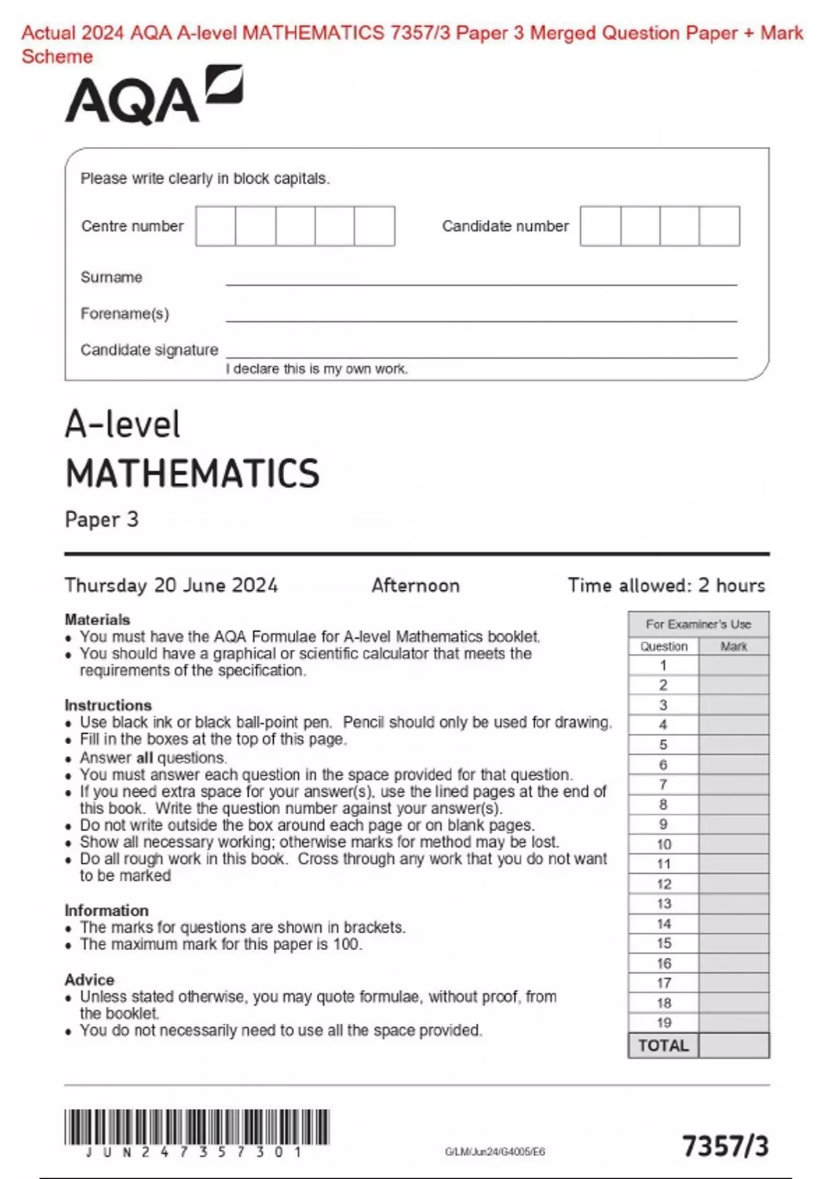 Actual 2024 AQA A-level MATHEMATICS 7357/3 Paper 3 Merged Question Paper + Mark Scheme