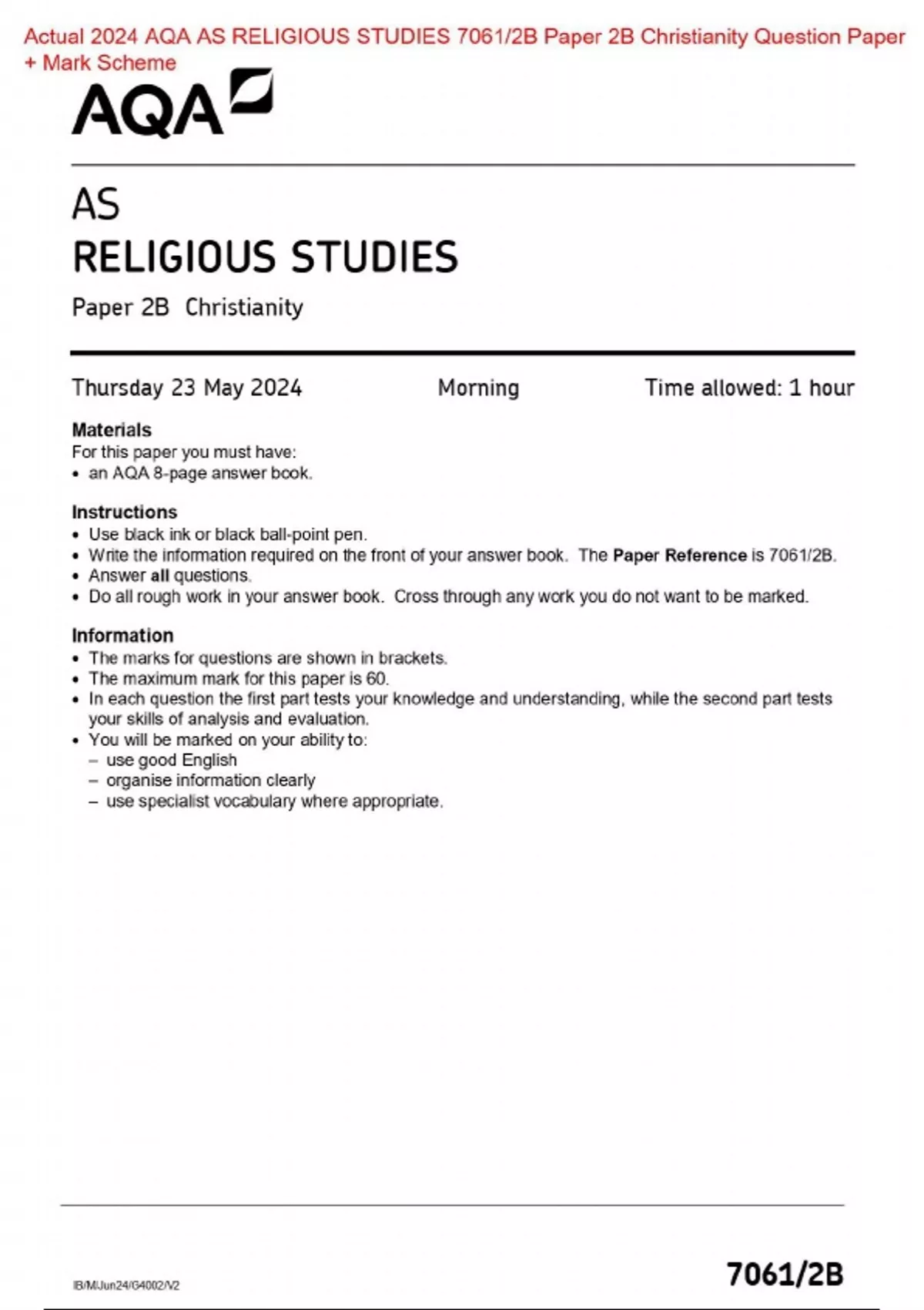 Actual 2024 AQA AS RELIGIOUS STUDIES 7061/2B Paper 2B Christianity Merged Question Paper + Mark Scheme