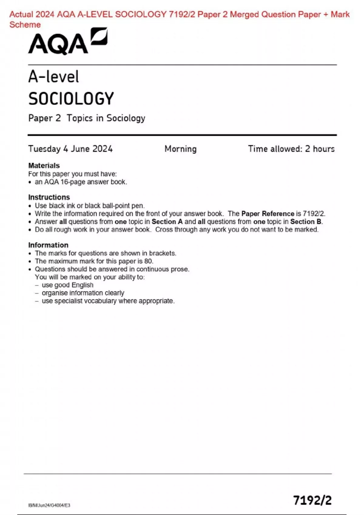 Actual 2024 AQA A-LEVEL SOCIOLOGY 7192/2 Paper 2 Topics in Sociology Merged Question Paper + Mark Scheme
