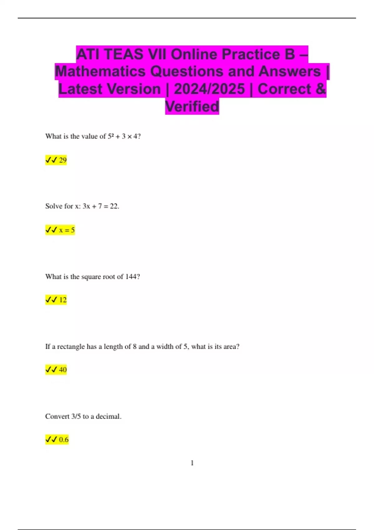 ATI TEAS VII Online Practice B – Mathematics Questions and Answers | Latest Version | 2024/2025 | Correct & Verified What is the value of 52 + 3 × 4? 29 Solve for x: 3x + 7 = 22. x = 5 What is the square root of 144? 12 If a rectangle has a length of 8 and a width of 5, what is its area? 40 Convert 3/5 to a decimal. 0.6 2 What is 15% of 200? 30 If a store sells 4 apples for $2.40, what is the price per apple? $0.60 What is the next number in the pattern: 2, 6, 18, 54, ___? 162 Solve: 6 ÷ (2 + 1). 2 A triangle has angles measuring 50° and 60°. What is the measure of the third angle? 70° What is the perimeter of a square with sides of length 9? 36 3 What is the product of 8 and 7? 56 If a car travels 240 miles in 4 hours, what is its average speed? 60 mph Round 4.738 to the nearest tenth. 4.7 What is the sum of the first five positive even numbers? 30 A recipe calls for 2.5 cups of sugar, but you only want to make half the recipe. How much sugar do you need? 1.25 cups Solve for x: 5x - 10 = 20. 4 x = 6 A store offers a 20% discount on a $50 item. What is the sale price? $40 Convert 0.75 to a fraction in simplest form.