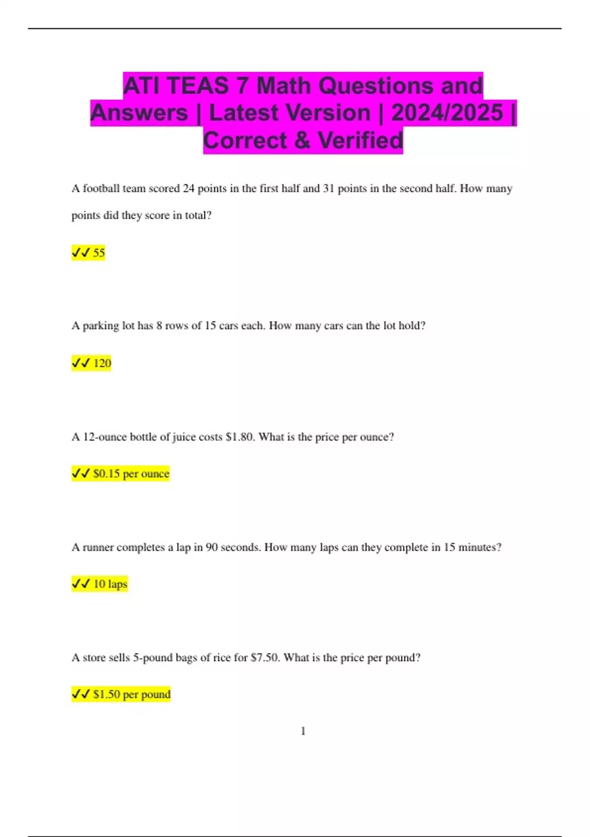 ATI TEAS 7 Math Questions and Answers | Latest Version | 2024/2025 | Correct & Verified A football team scored 24 points in the first half and 31 points in the second half. How many points did they score in total? 55 A parking lot has 8 rows of 15 cars each. How many cars can the lot hold? 120 A 12-ounce bottle of juice costs $1.80. What is the price per ounce? $0.15 per ounce A runner completes a lap in 90 seconds. How many laps can they complete in 15 minutes? 10 laps A store sells 5-pound bags of rice for $7.50. What is the price per pound? $1.50 per pound 2 A school has 350 students. If 60% are boys, how many are girls? 140 girls A person runs 3.5 miles every day. How many miles do they run in 10 days? 35 miles A company pays an employee $1,200 every two weeks. How much do they earn in a year? $31,200 A car's speed is 45 miles per hour. How far will it travel in 2.5 hours? 112.5 miles A wall is 20 feet long and 9 feet high. What is the area? 180 square feet A box contains 48 pencils. If a student takes 3/8 of them, how many pencils are left? 30 pencils 3