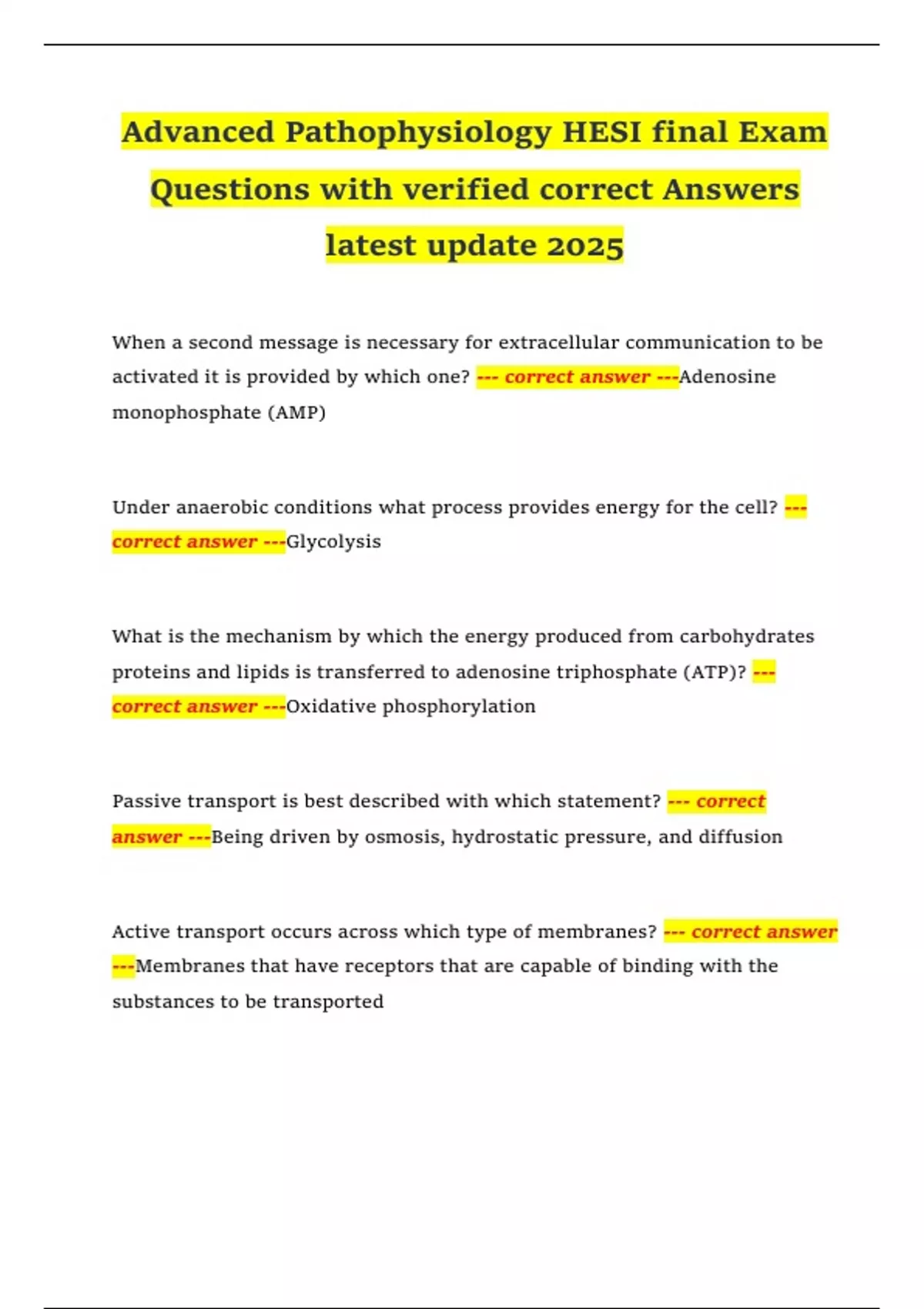 Advanced Pathophysiology HESI final Exam Questions with verified correct Answers latest update 2025 When a second message is necessary for extracellular communication to be activated it is provided by which one? --- correct answer ---Adenosine monophosphate (AMP) Under anaerobic conditions what process provides energy for the cell? --- correct answer ---Glycolysis What is the mechanism by which the energy produced from carbohydrates proteins and lipids is transferred to adenosine triphosphate (ATP)? --- correct answer ---Oxidative phosphorylation Passive transport is best described with which statement? --- correct answer ---Being driven by osmosis, hydrostatic pressure, and diffusion Active transport occurs across which type of membranes? --- correct answer ---Membranes that have receptors that are capable of binding with the substances to be transported