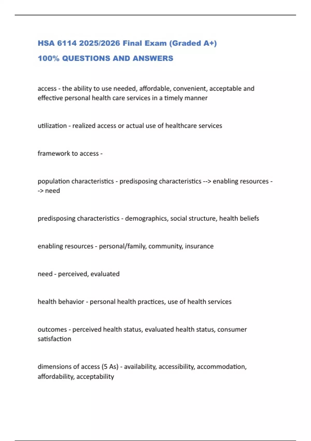 HSA /2026 Final Exam (Graded A+) 100% QUESTIONS AND ANSWERS access - the ability to use needed, affordable, convenient, acceptable and effective personal health care services in a timely manner utilization - realized access or actual use of healthcare services framework to access - population characteristics - predisposing characteristics --> enabling resources --> need predisposing characteristics - demographics, social structure, health beliefs enabling resources - personal/family, community, insurance need - perceived, evaluated health behavior - personal health practices, use of health services outcomes - perceived health status, evaluated health status, consumer