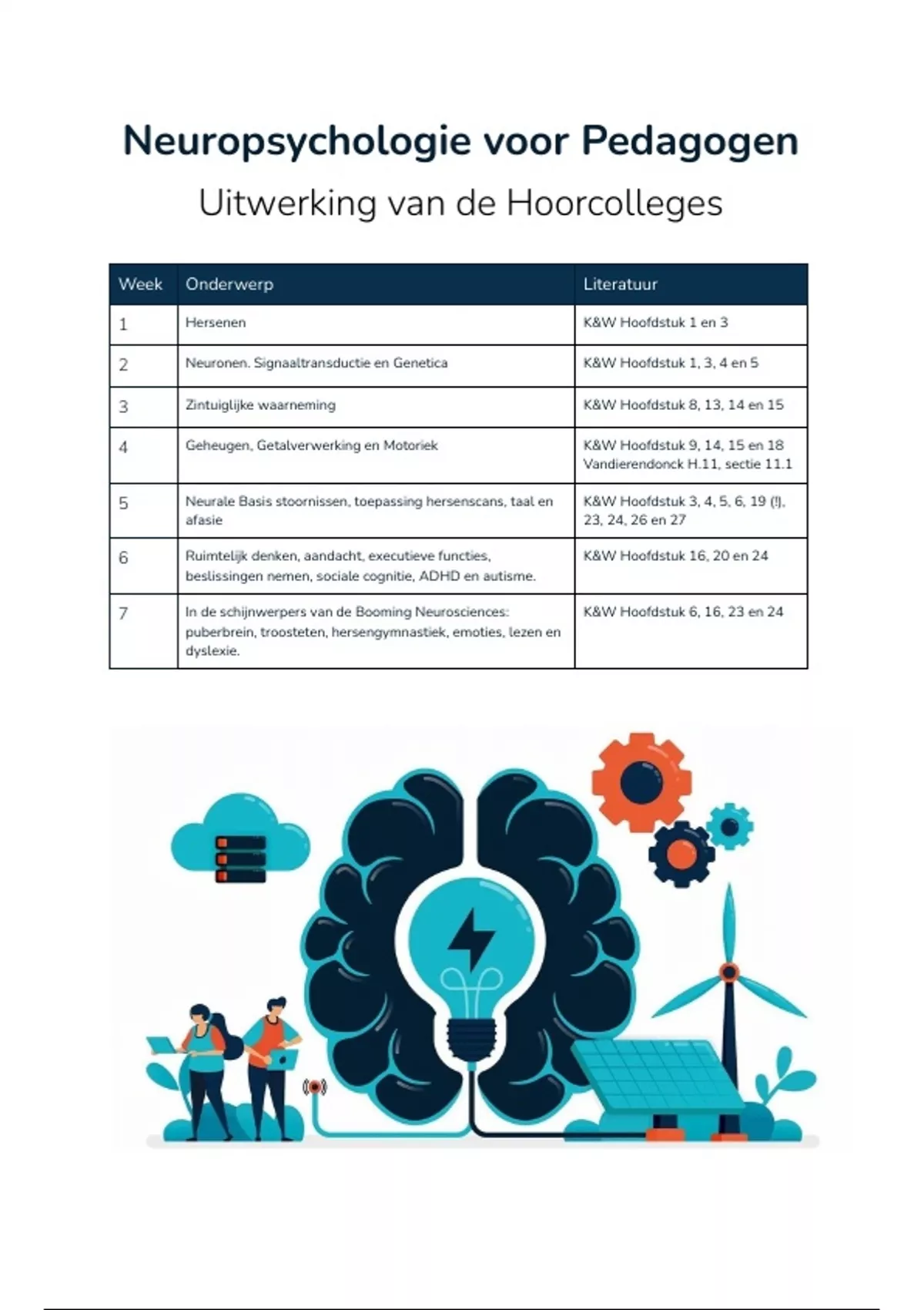 De samenvatting bevat uitgebreide aantekeningen van het vak Neuropsychologie voor zowel studenten pedagogische wetenschappen als psychologie. Concepten worden duidelijk en helder uitgelegd met uitgewerkte voorbeelden.