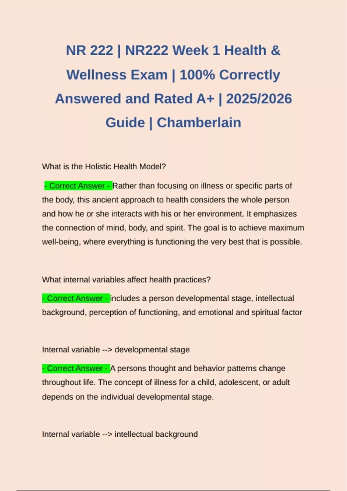 NR 222 | NR222 Week 1 Health & Wellness Exam | 100% Correctly Answered and Rated A+ | 2025/2026 Guide | Chamberlain NR 222 | NR222 Week 1 Health & Wellness Exam | 100% Correctly Answered and Rated A+ | 2025/2026 Guide | Chamberlain NR 222 | NR222 Week 1 Health & Wellness Exam | 100% Correctly Answered and Rated A+ | 2025/2026 Guide | Chamberlain