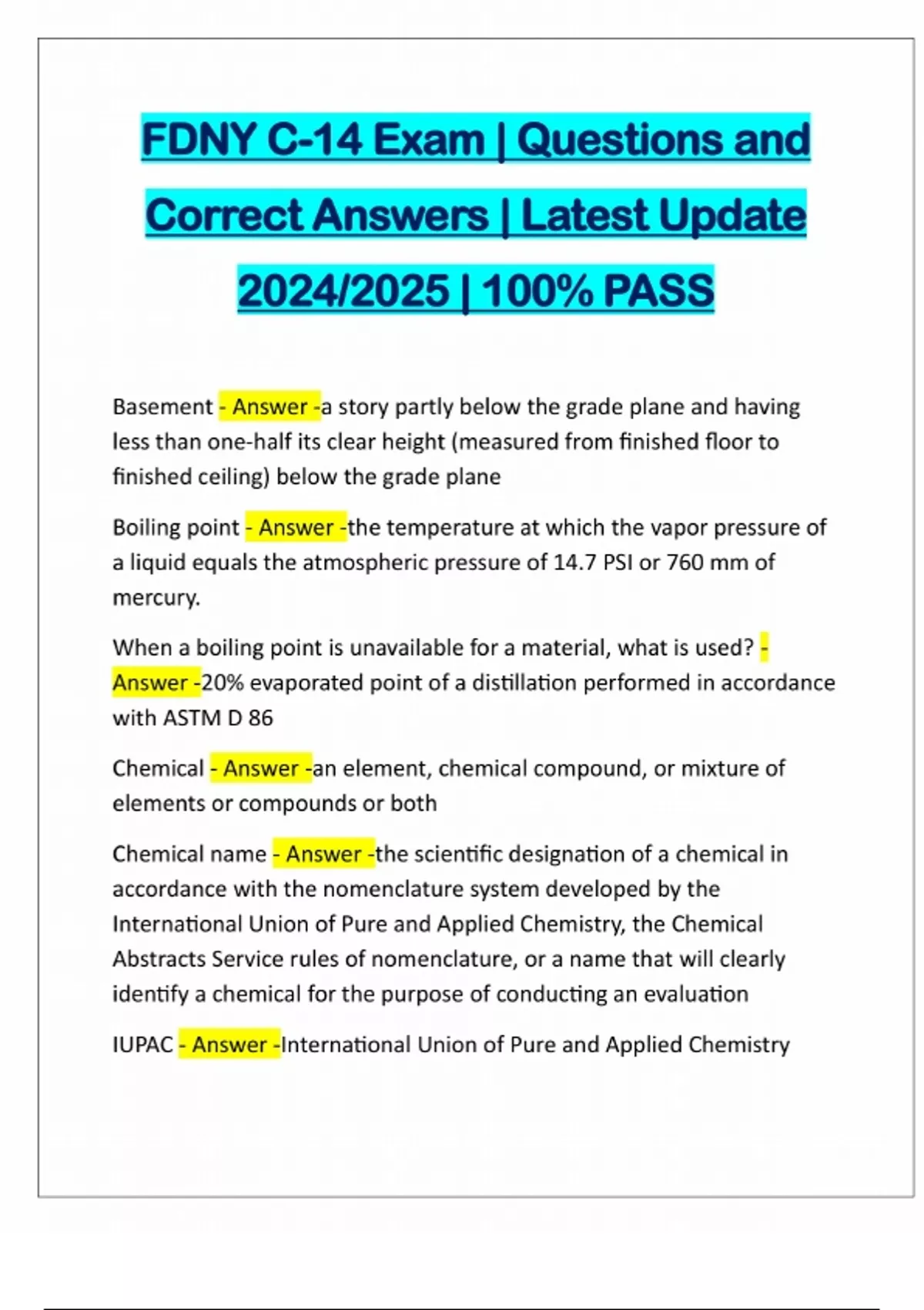 FDNY C-14 Exam | Questions and Correct Answers | Latest Update 2024/2025 | 100% PASS