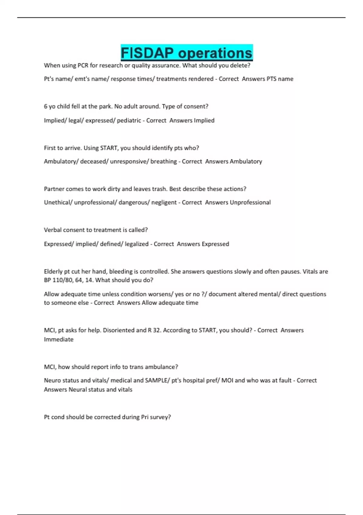 FISDAP operations When using PCR for research or quality assurance. What should you delete? Pt's name/ emt's name/ response times/ treatments rendered - Correct Answers PTS name 6 yo child fell at the park. No adult around. Type of consent? Implied/ legal/ expressed/ pediatric - Correct Answers Implied First to arrive. Using START, you should identify pts who? Ambulatory/ deceased/ unresponsive/ breathing - Correct Answers Ambulatory Partner comes to work dirty and leaves trash. Best describe these actions? Unethical/ unprofessional/ dangerous/ negligent - Correct Answers Unprofessional Verbal consent to treatment is called? Expressed/ implied/ defined/ legalized - Correct Answers Expressed Elderly pt cut her hand, bleeding is controlled. She answers questions slowly and often pauses. Vitals are BP 110/80, 64, 14. What should you do? Allow adequate time unless condition worsens/ yes or no ?/ document altered mental/ direct questions to someone else - Correct Answers Allow adequate time MCI, pt asks for help. Disoriented and R 32. According to START, you should? - Correct Answers Immediate MCI, how should report info to trans ambulance? Neuro status and vitals/ medical and SAMPLE/ pt's hospital pref/ MOI and who was at fault - Correct Answers Neural status and vitals Pt cond should be corrected during Pri survey? 12 yo dyspnea from allergic reaction/ 28 yo rapid pulse stung by several bees/ 22 yo ab pain baseball bat/ 45 yo mod chest pain, no palp BP - Correct Answers 12 yo dyspnea from allergic reaction 58 yo heavy chest pressure. Ask you what is cause. You should? Hospital staff will explain/ heart not getting enough O2/ acute MI/ can't explain bc HIPAA - Correct Answers Hospital staff will explain Legal case against you. What is your best defense in court? Complete and thorough report/ dispatch records/ partner's supporting testimony/ immediate recollection of events - Correct Answers Complete and thorough report Alert 67 yo refuses care and requests to release form? What should you do? Explain risks/ restrain and trans/ provide supportive care and allow refusal/ ask PD to place in protective custody - Correct Answers Explain risk Pt shot in head no signs of life. Brain matter on floor. You should? Cover pt and contact coroner/ leave scene untouched and contact PD/ resus measures and tran/ permit fam to view and emotional support - Correct Answers Leave scene untouched and contact PD Most effective way to stop spread of infectious diseases? Gloves all pts/ good hand washing/ avoid bodily fluids/ face shield all calls - Correct Answers Good hand washing START, open airway, he begins breathing and is unresponsive. This pt should be classified? - Correct Answers Immediate Finalizing PCR, notice incorrect pulse reading. What should you do? - Correct Answers Single horizontal line, correct, initial Arrive large fight, pointed to stab victim. You should? Drive away and stage/ quickly load and tran/ treat and request ALS/ treat and request police - Correct Answers Drive away and stage Pt dead when you arrive. Rigor mortis already set in. you should? Direct fam to contact coroner and leave scene/ *tell bad news and emotional supp/ pt dead nothing you can do/ fam sign refusal and clear scene - Correct Answers tell bad news and emotional supp Honor DNR when? Given appropriate paperwork/ fam requests/ confirm with physician/ pt's cond is irreversible - Correct Answers Given appropriate paperwork