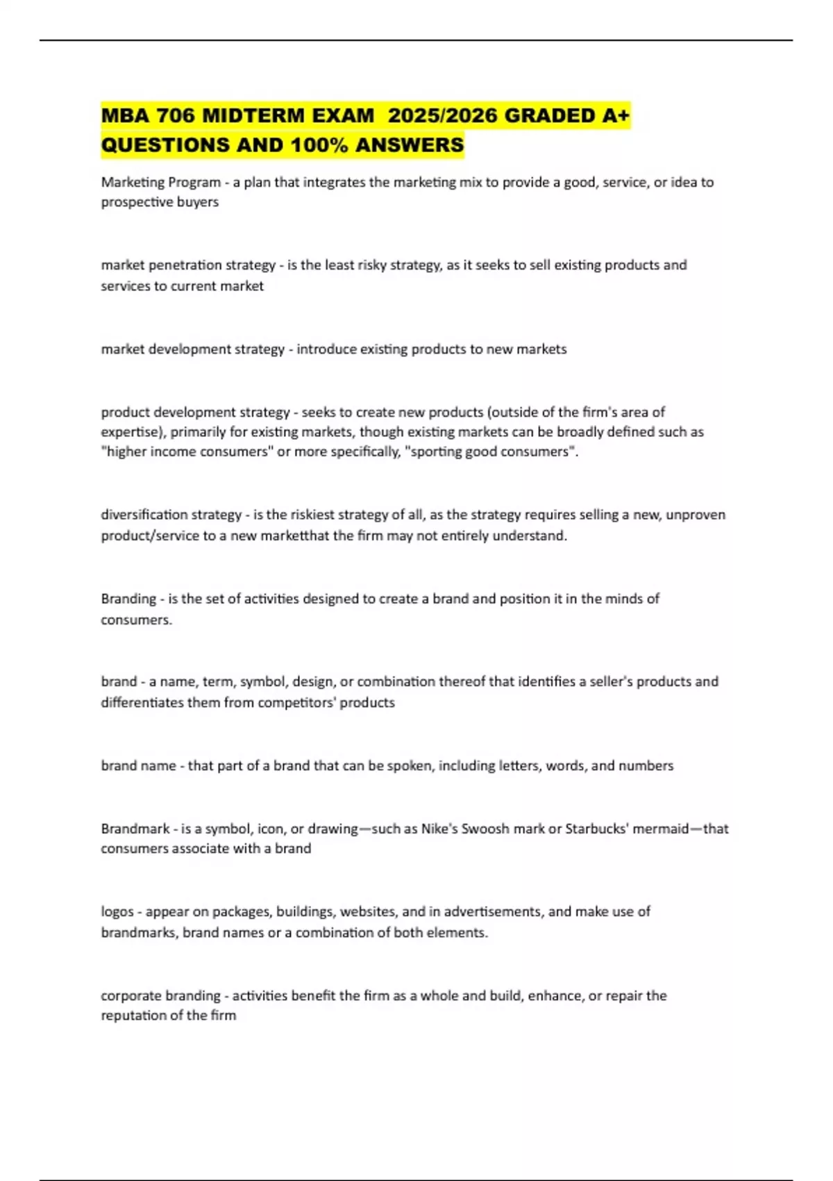 MBA 706 MIDTERM EXAM 2025/2026 GRADED A+ QUESTIONS AND 100% ANSWERS Marketing Program - a plan that integrates the marketing mix to provide a good, service, or idea to prospective buyers market penetration strategy - is the least risky strategy, as it seeks to sell existing products and services to current market market development strategy - introduce existing products to new markets product development strategy - seeks to create new products (outside of the firm's area of expertise), primarily for existing markets, though existing markets can be broadly defined such as "higher income consumers" or more specifically, "sporting good consumers". diversification strategy - is the riskiest strategy of all, as the strategy requires selling a new, unproven product/service to a new marketthat the firm may not entirely understand. Branding - is the set of activities designed to create a brand and position it in the minds of consumers. brand - a name, term, symbol, design, or combination thereof that identifies a seller's products and differentiates them from competitors' products brand name - that part of a brand that can be spoken, including letters, words, and numbers Brandmark - is a symbol, icon, or drawing—such as Nike's Swoosh mark or Starbucks' mermaid—that consumers associate with a brand logos - appear on packages, buildings, websites, and in advertisements, and make use of brandmarks, brand names or a combination of both