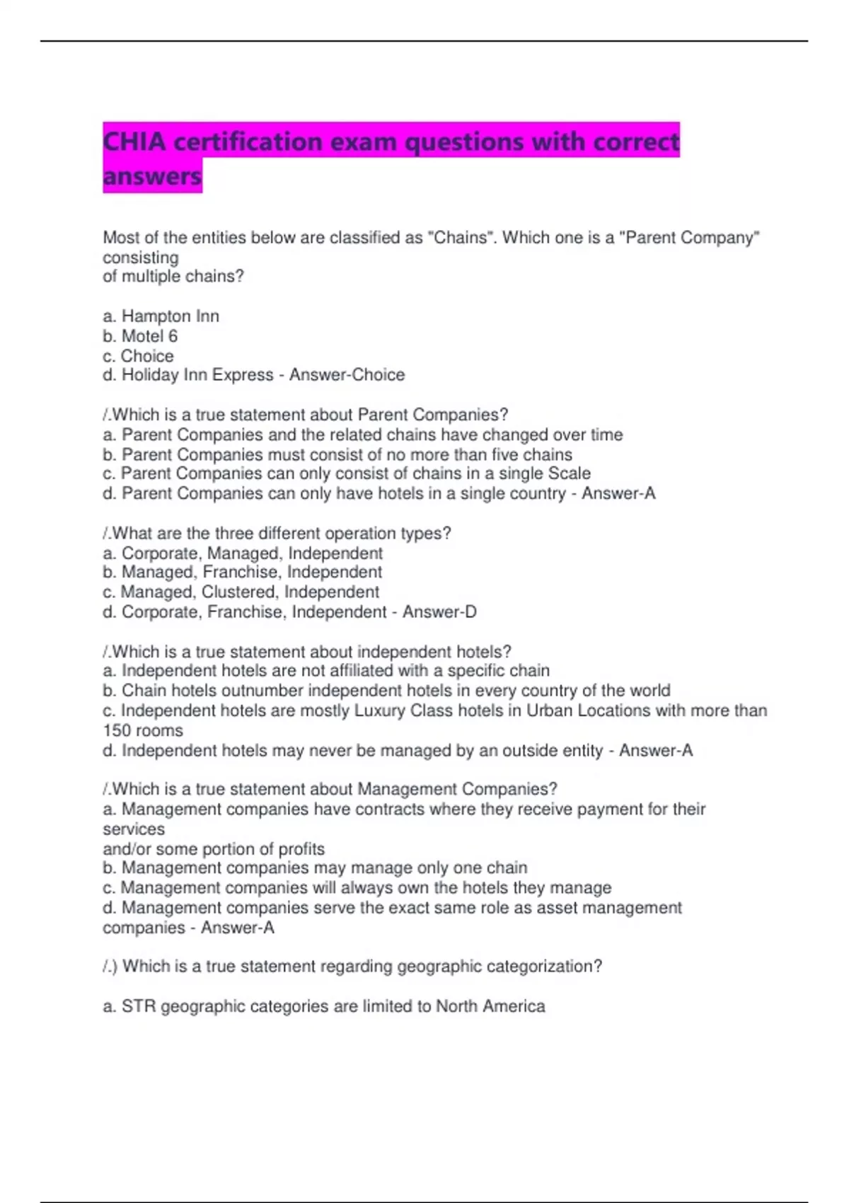 d. Independent hotels may never be managed by an outside entity - Answer-A