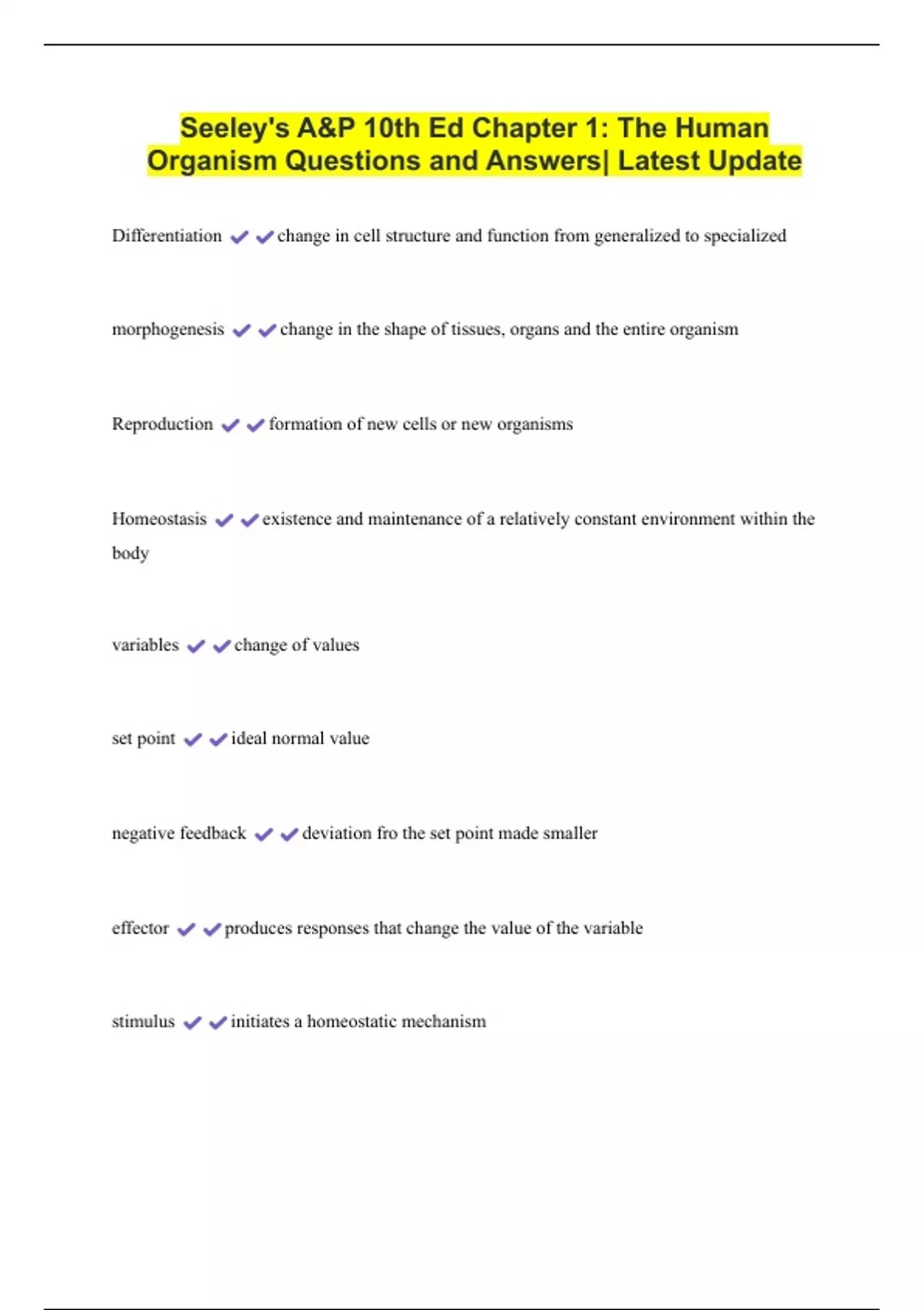 Seeley's A&P 10th Ed Chapter 1: The Human Organism Questions and Answers| Latest Update